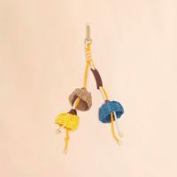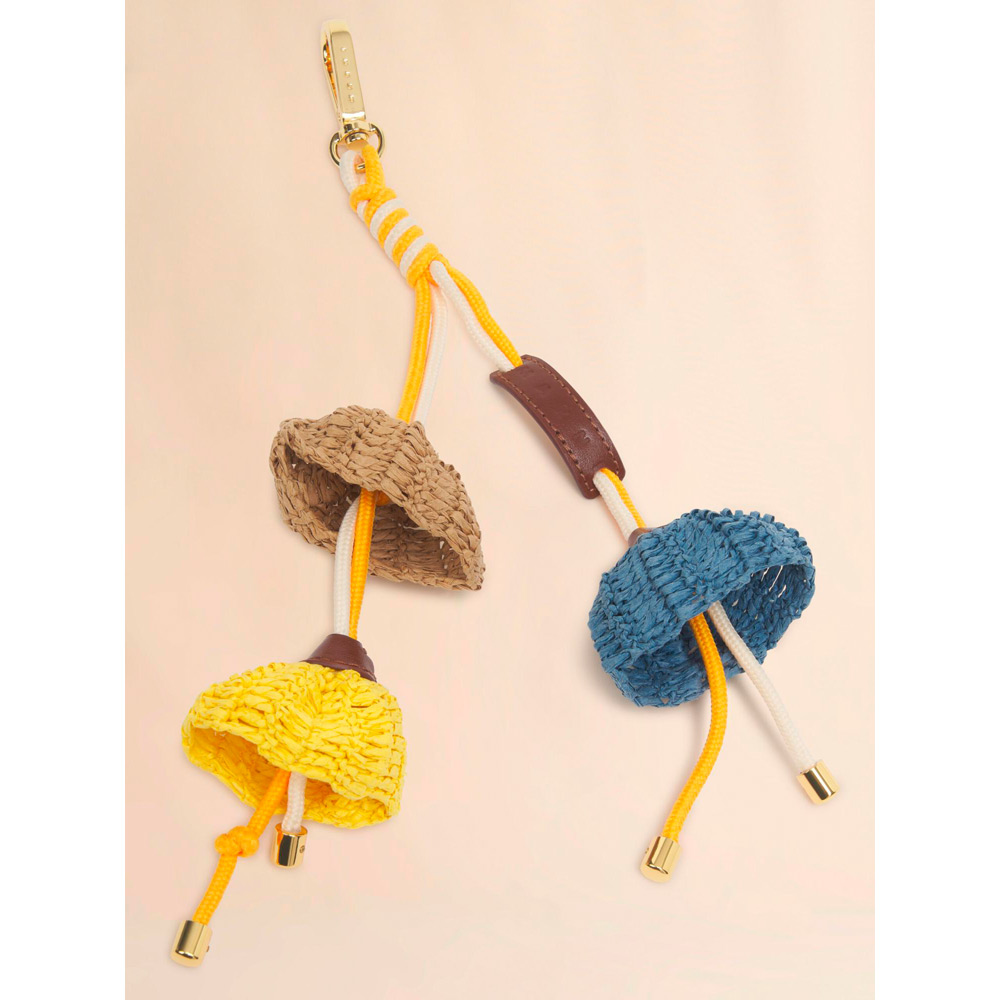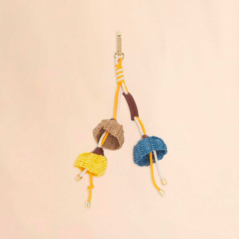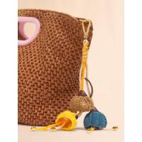 カラフルでエネルギッシュなムードを表現したフラワーチャーム。木製の型を用い、一本の糸で編み上げることで、立体的なフラワーフォルムを表現。フラワー部分にはペーパーストロー素材を使用し、中心にはコードを留めたメタルディテールを配している。手作業による仕上げのため、一点一点異なる表情がポイント。
