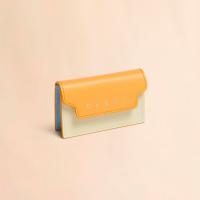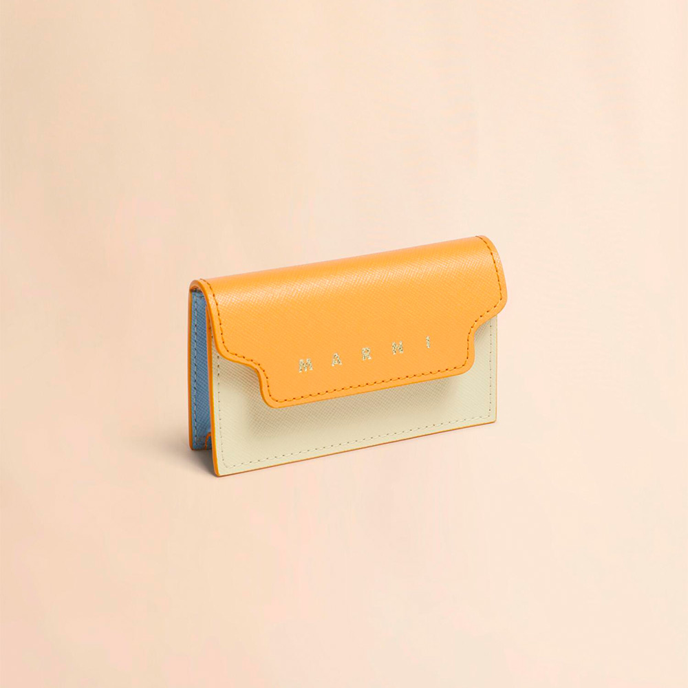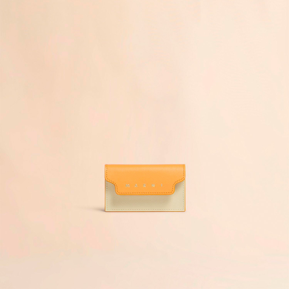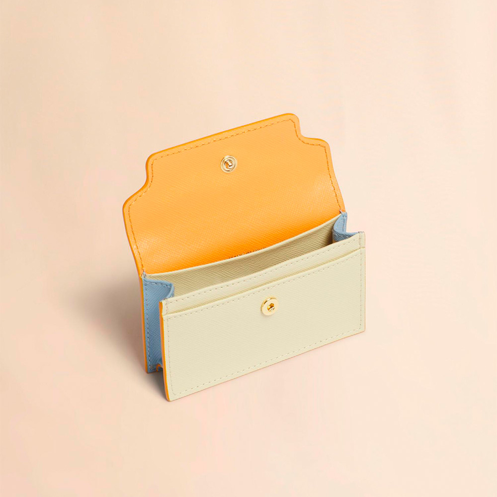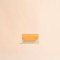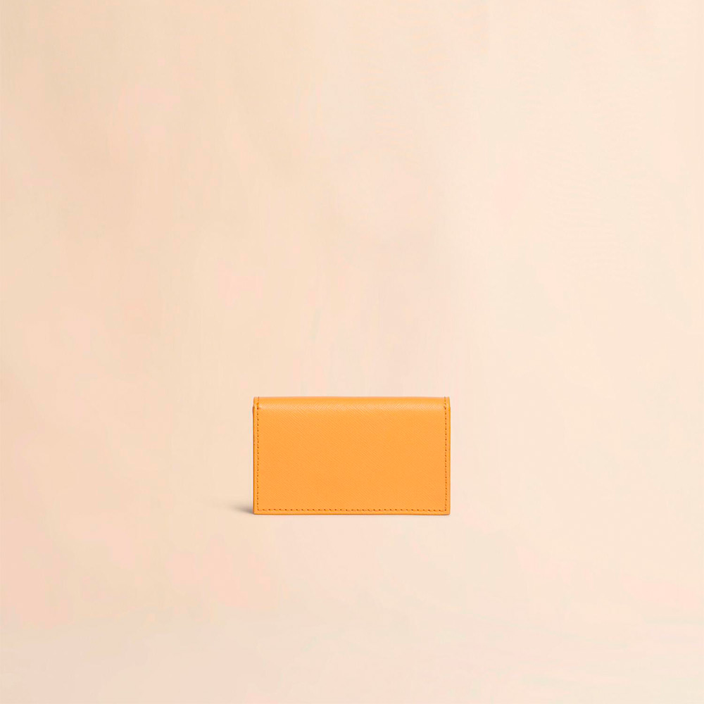 サフィアーノレザー製のカードケース。名刺入れ1つ、クレジットカードスロット1つのコンパクトなカードケース。フロントに施されたコントラストカラーのロゴがポイントに。