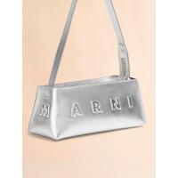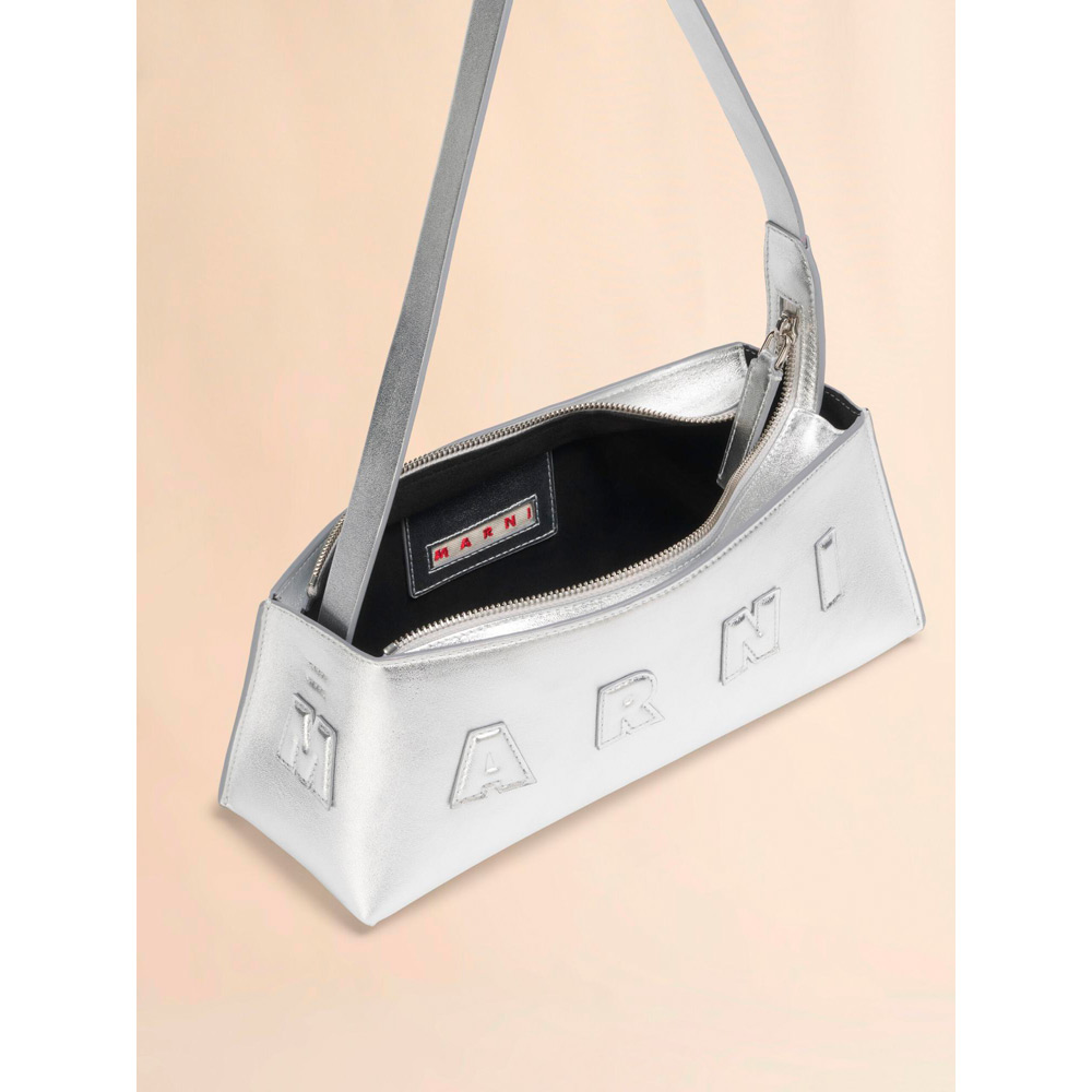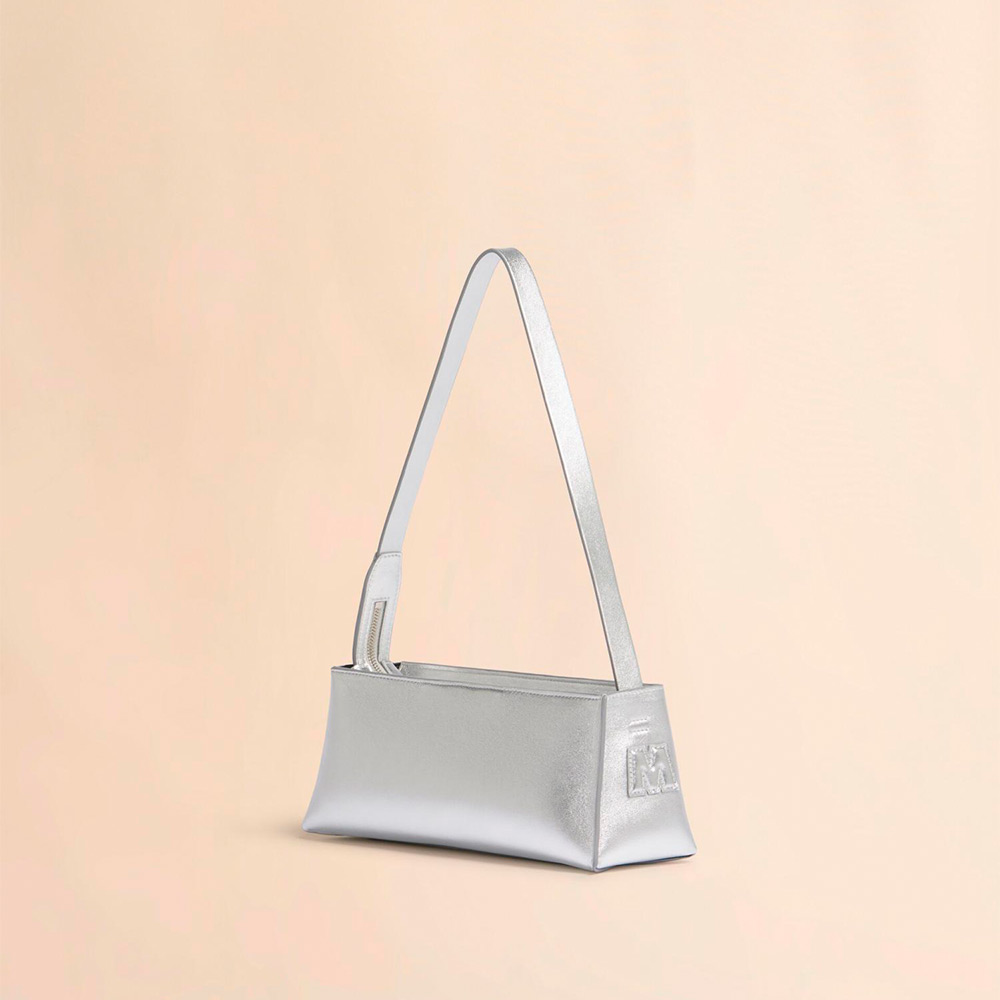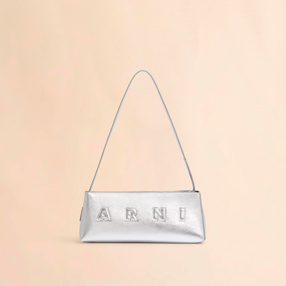 ラミネート加工を施したレザーを使用した“MUSEO HOBO”バゲットバッグ。横長フォルムに大胆なロゴを配したデザイン。