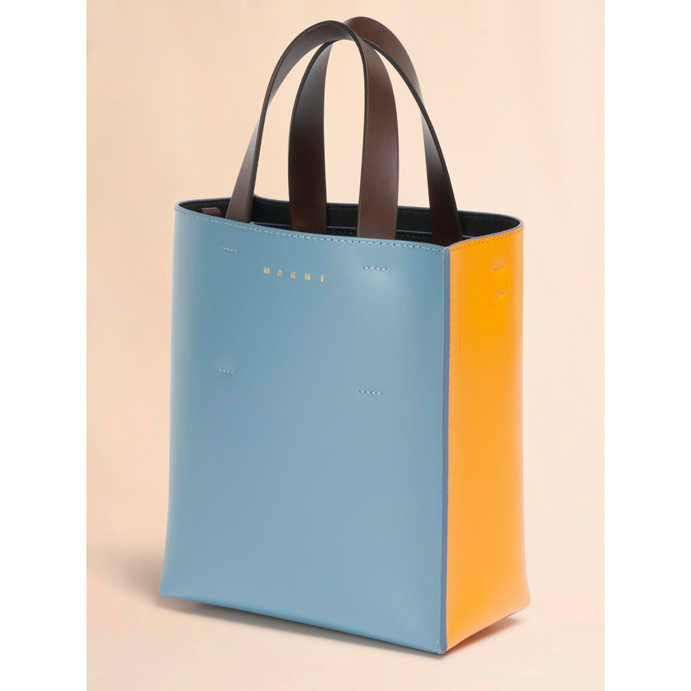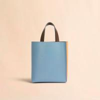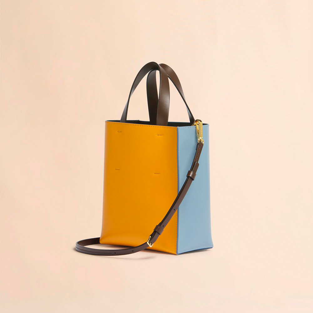 ポリッシュカーフレザーの”MUSEO”ミニバッグ。取り外し可能なショルダーストラップ、内側にスロットポケット、布製の巾着バッグ付き。フロントにロゴ入り。