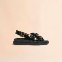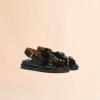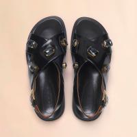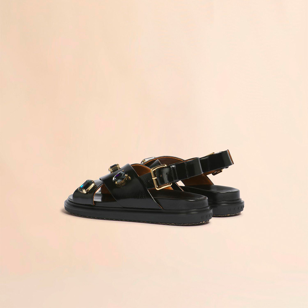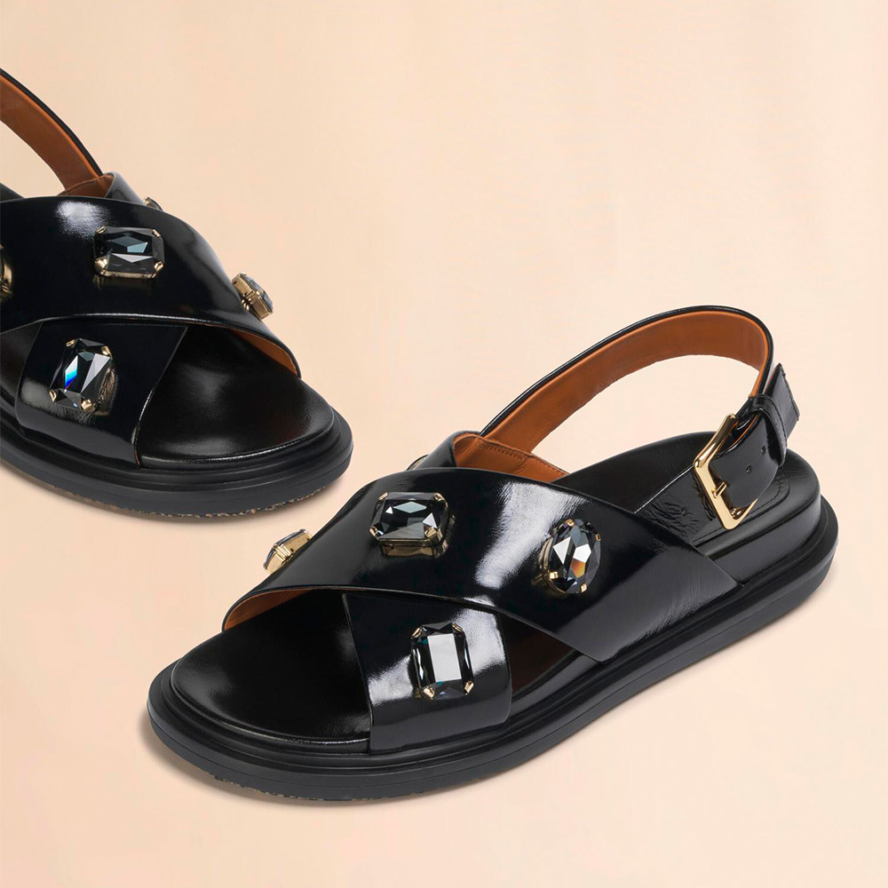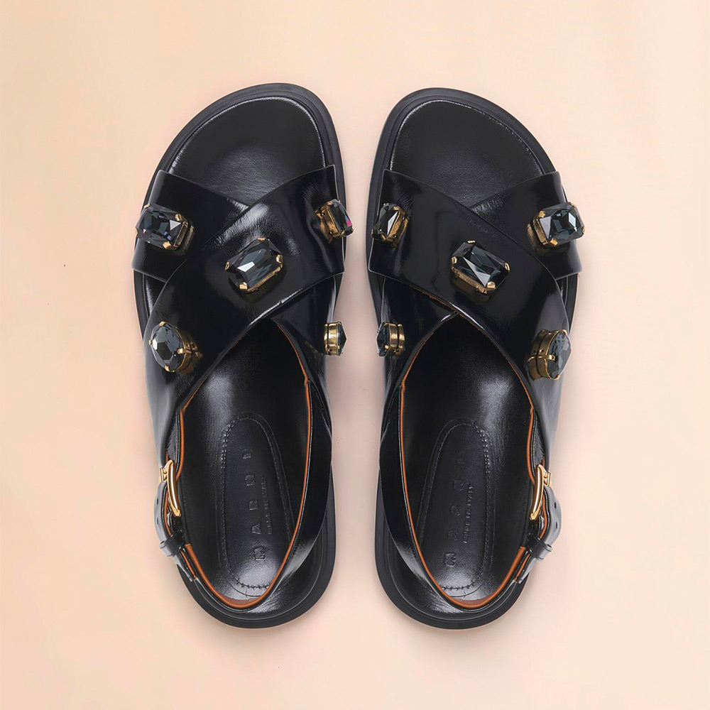 クリスタルを手仕事によりあしらったフスベットサンダル。高いクッション性を備えたボリュームのあるインソールを採用。