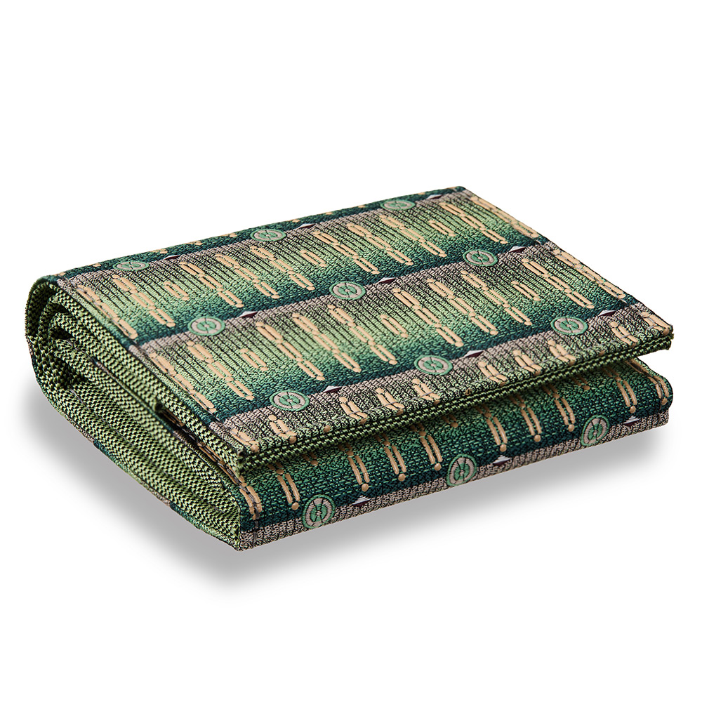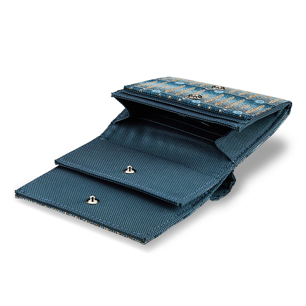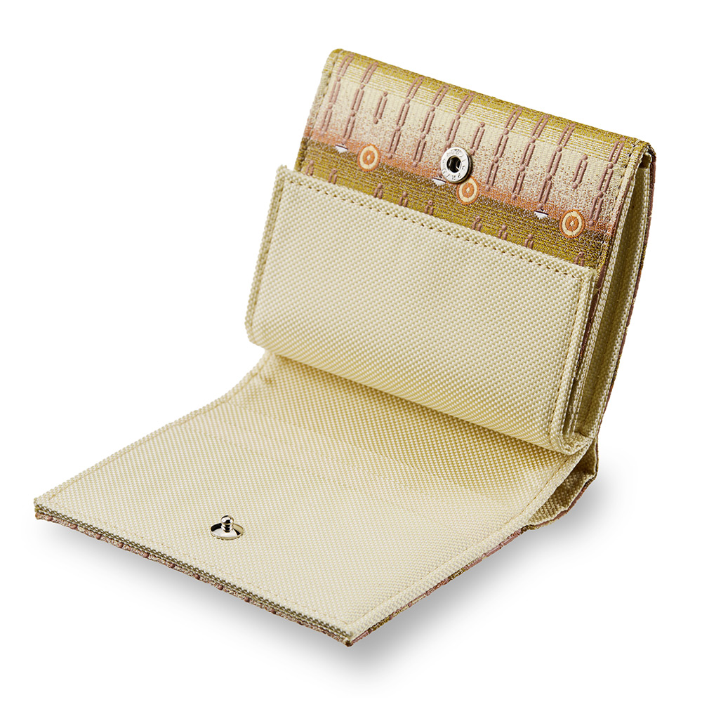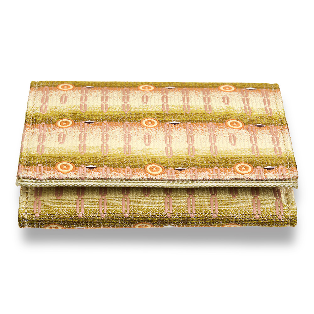 西陣織に印伝技法で漆を施したハーフウォレット。触れるたびに伝わる質感と美しさが、日々の暮らしに確かな彩りをもたらします。