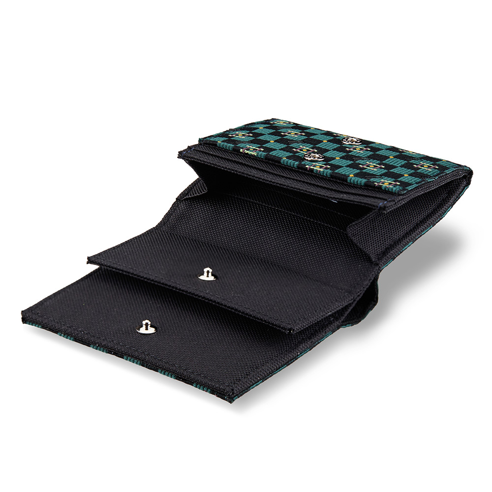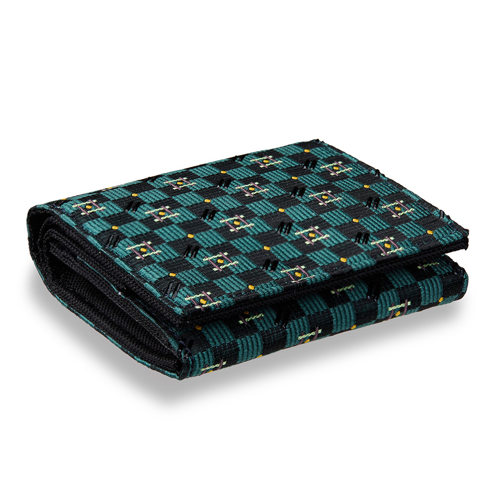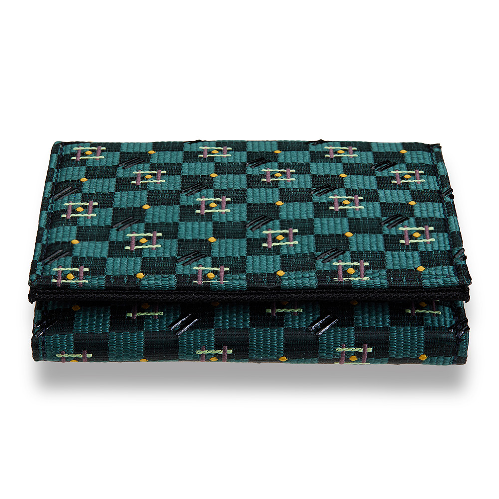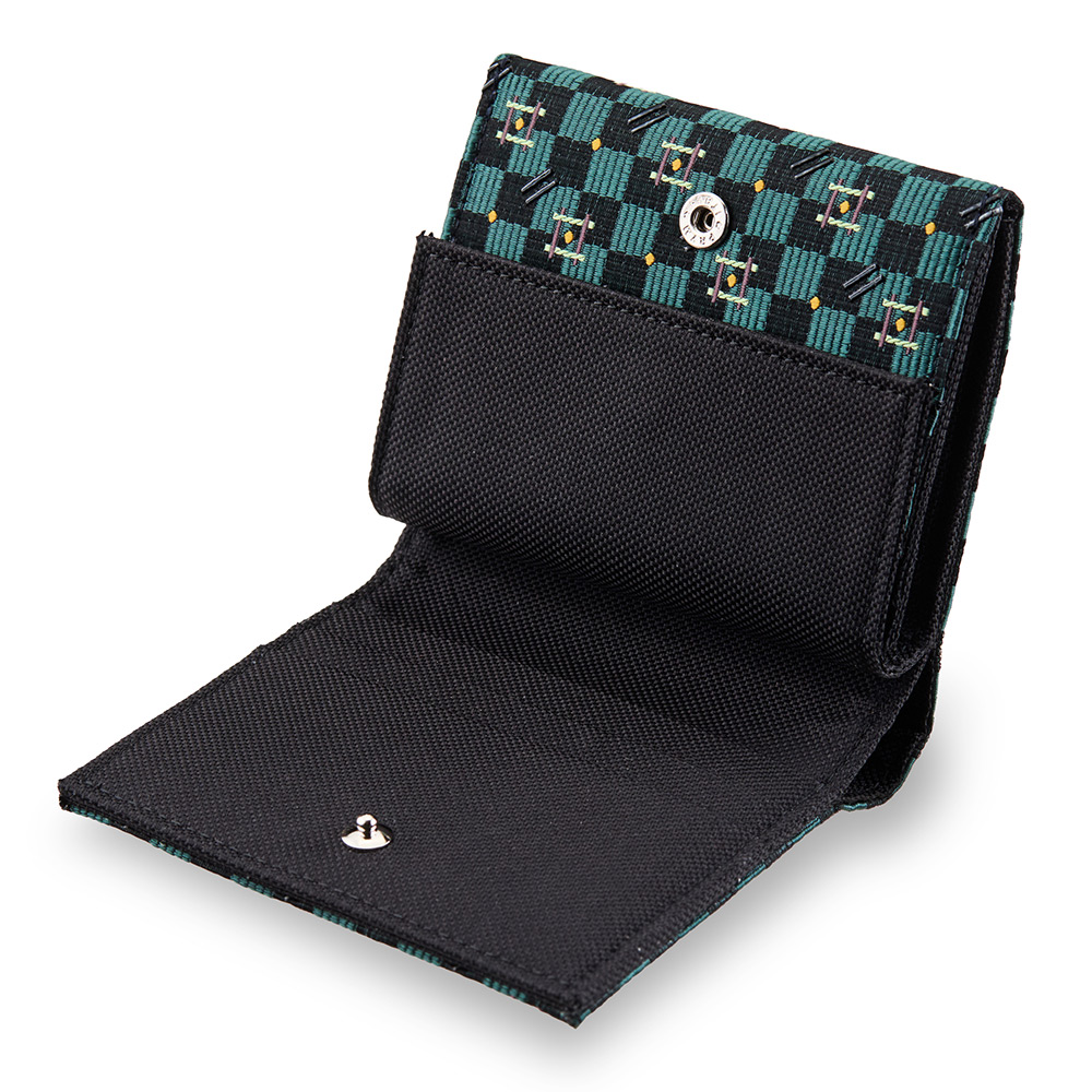 西陣織に印伝技法で漆を施したハーフウォレット。触れるたびに伝わる質感と美しさが、日々の暮らしに確かな彩りをもたらします。