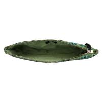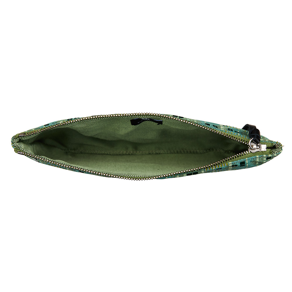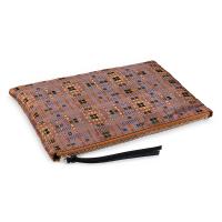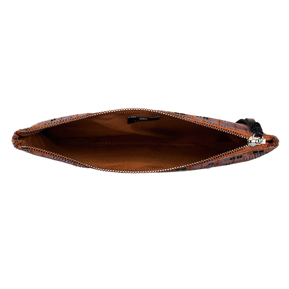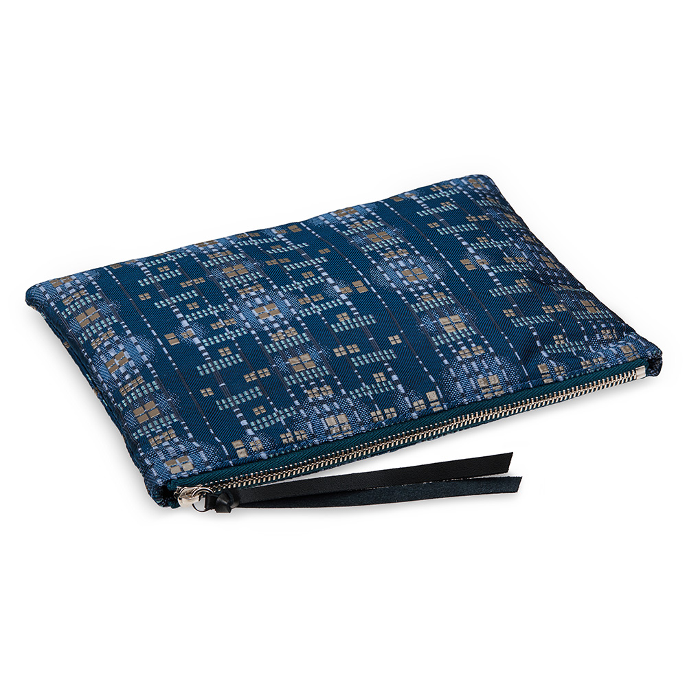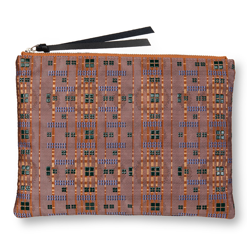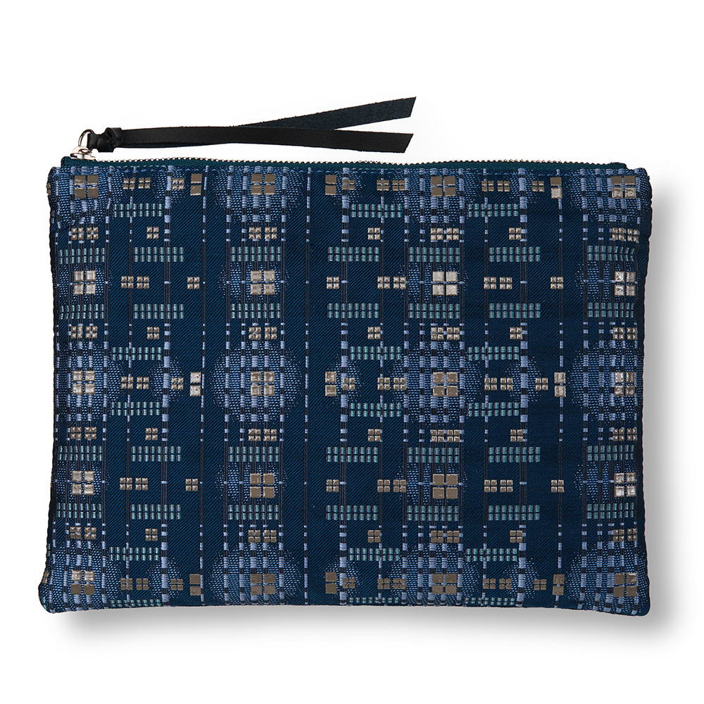 西陣織に印伝技法で漆を施したポーチ。レザーのタッセルがアクセントとなり、程よいサイズ感はあらゆるシーンで活用できる逸品となっています。