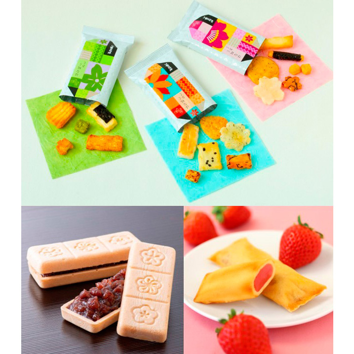 江戸美人(のり)、小粒抹茶、こしょう、さくらの形など、ひとつひとつ丹精こめて仕上げたバラエティー豊かなおせんべいを「花」「水」「緑」の3種の小袋に詰め合わせたはな咲くさく。栃木県産「とちあいか」使用のいちご餡をバター風味の生地で包んだふんわりしっとりの焼き菓子「いちごの贈りもの」。召しあがる直前に最中種と餡を取り出し合わせていただく最中「雅合わせ」。3種類のお菓子をお楽しみいただけるギフトです。