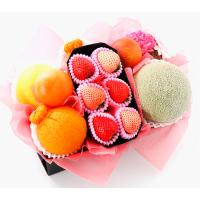 果汁豊富で上品な甘さのメロン、甘さと酸味のバランスのとれたデコポン、爽やかな味わいの河内晩柑などの柑橘、赤と白のいちご、華やかな生花を詰め合わせた贈りものにおすすめのフルーツギフトです。※食べ頃などを記載した商品説明リーフレットを同封いたします。