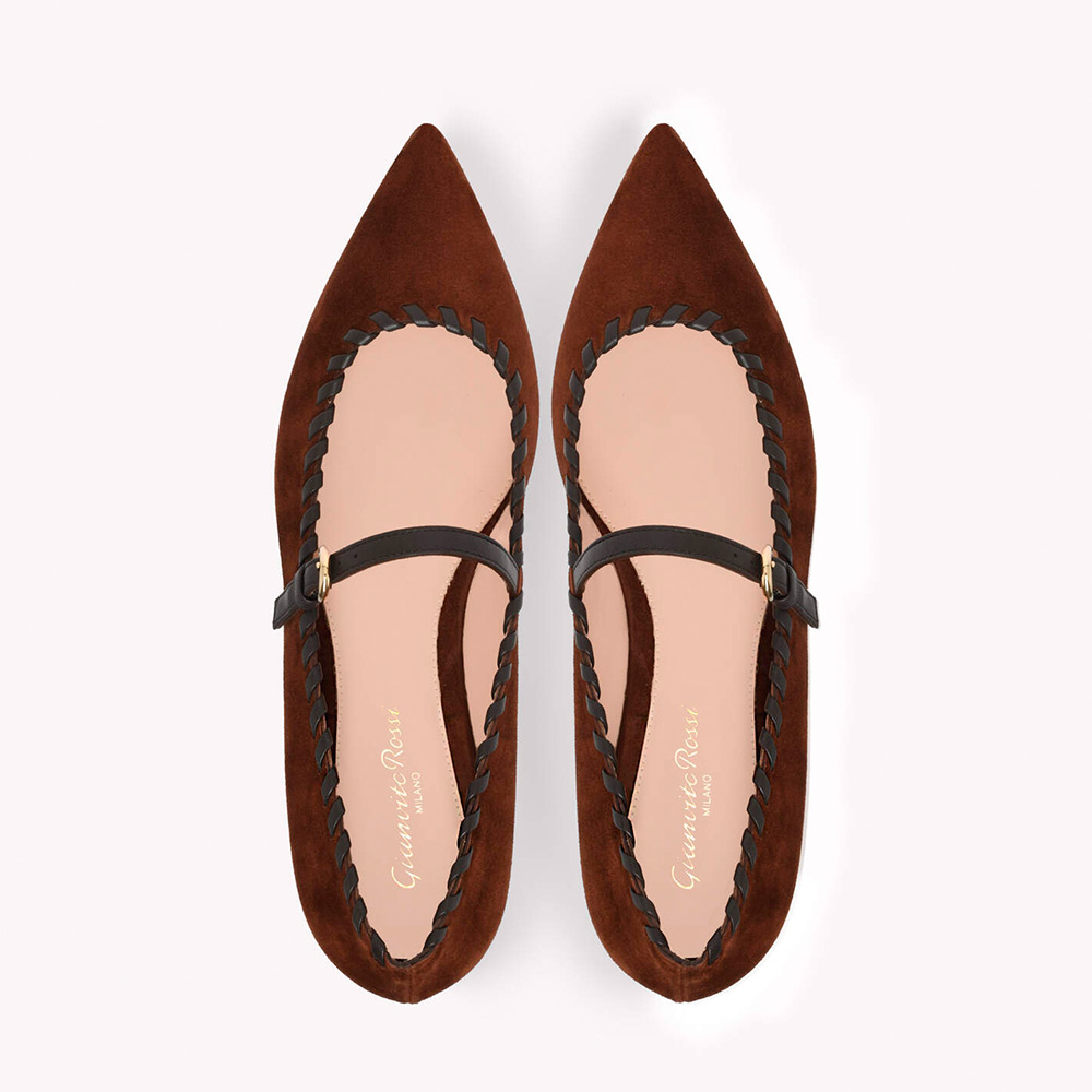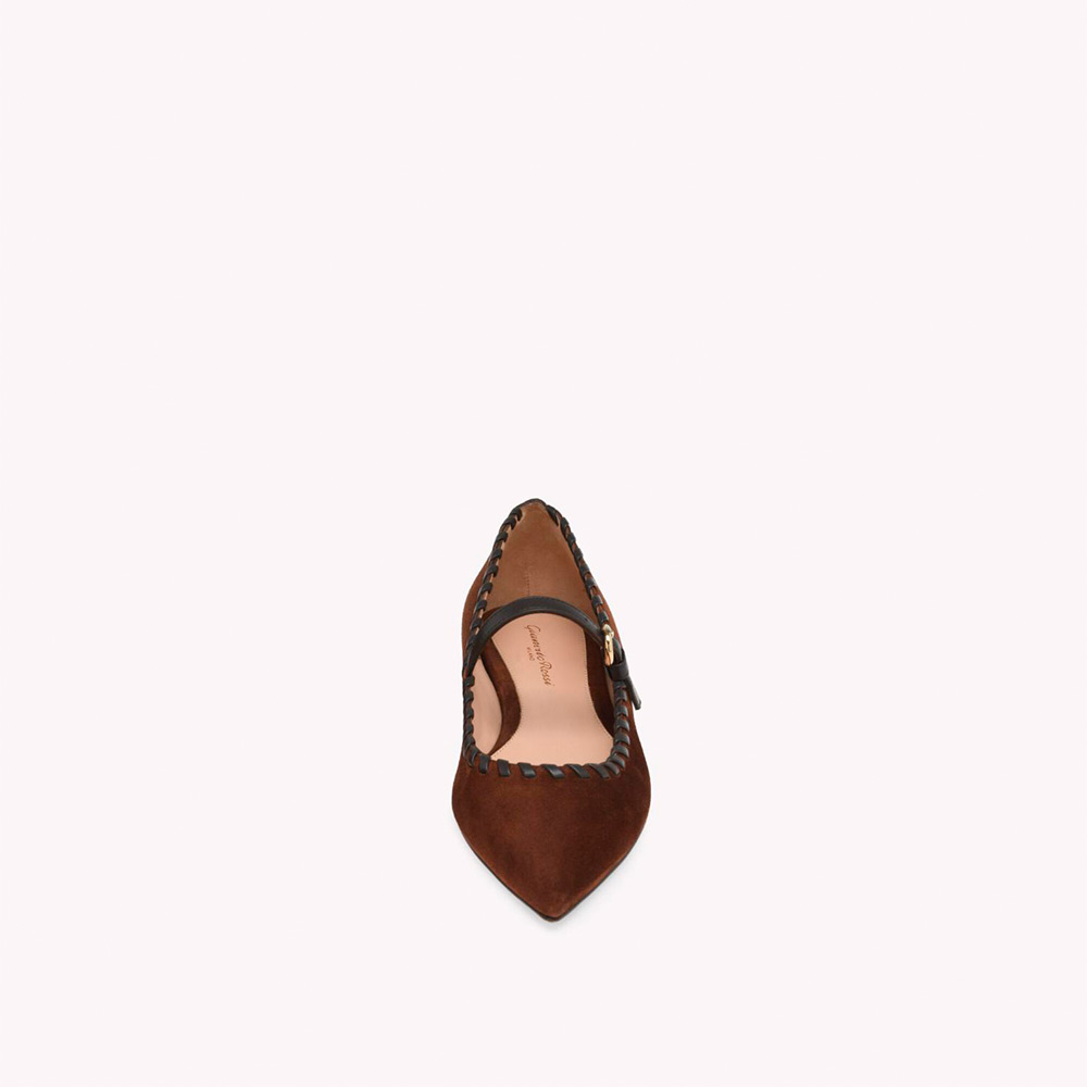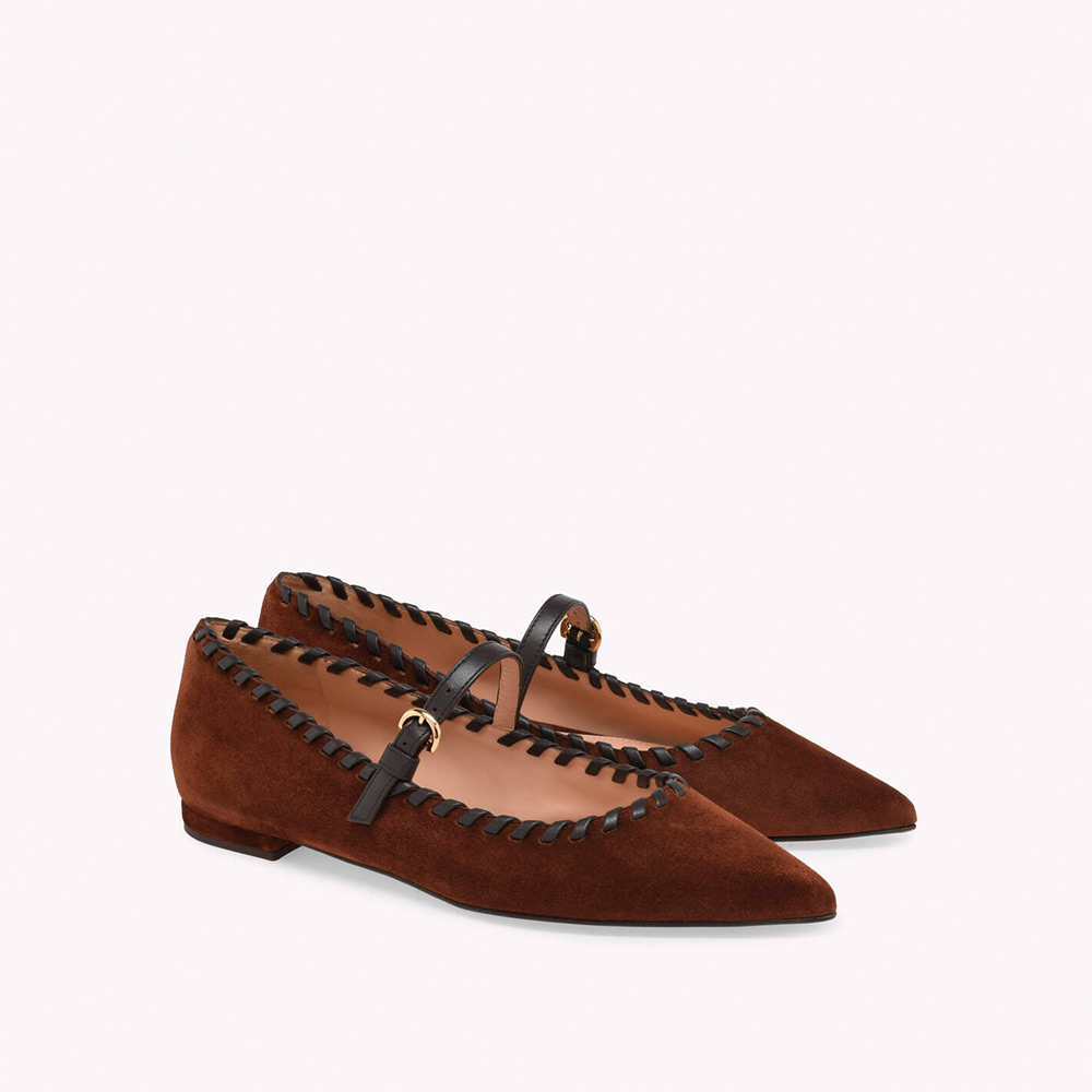 スエード地とレザーから丹念に作り上げたフラットなメリージェーンパンプスのZaira Flat。つま先の形はポインテッドトゥ。高さ10mmのローヒールのモデルです。モロッコの編み物の技法を用いて柔らかなレザーを丁寧に編み込んだデザインに、メゾンならではの巧みな職人技が光ります。約1時間の作業を経て、この個性的な柄を描き出しています。フロントストラップには、シグネチャーとして愛されるリボンバックルがあしらわれています。手作業によって仕上げました。