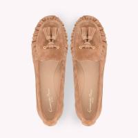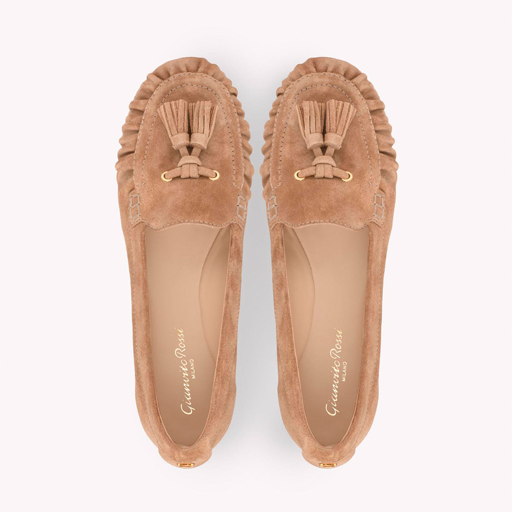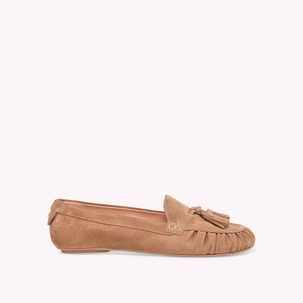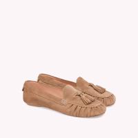 スエード地から丹念に作り上げたTHEAは、ラウンドトゥのフラットなモカシンシューズ。タッセル飾り付きで、縁はパイピング仕上げ。トーン・オン・トーンのラバー製ソールを備えています。手作業によって仕上げました。