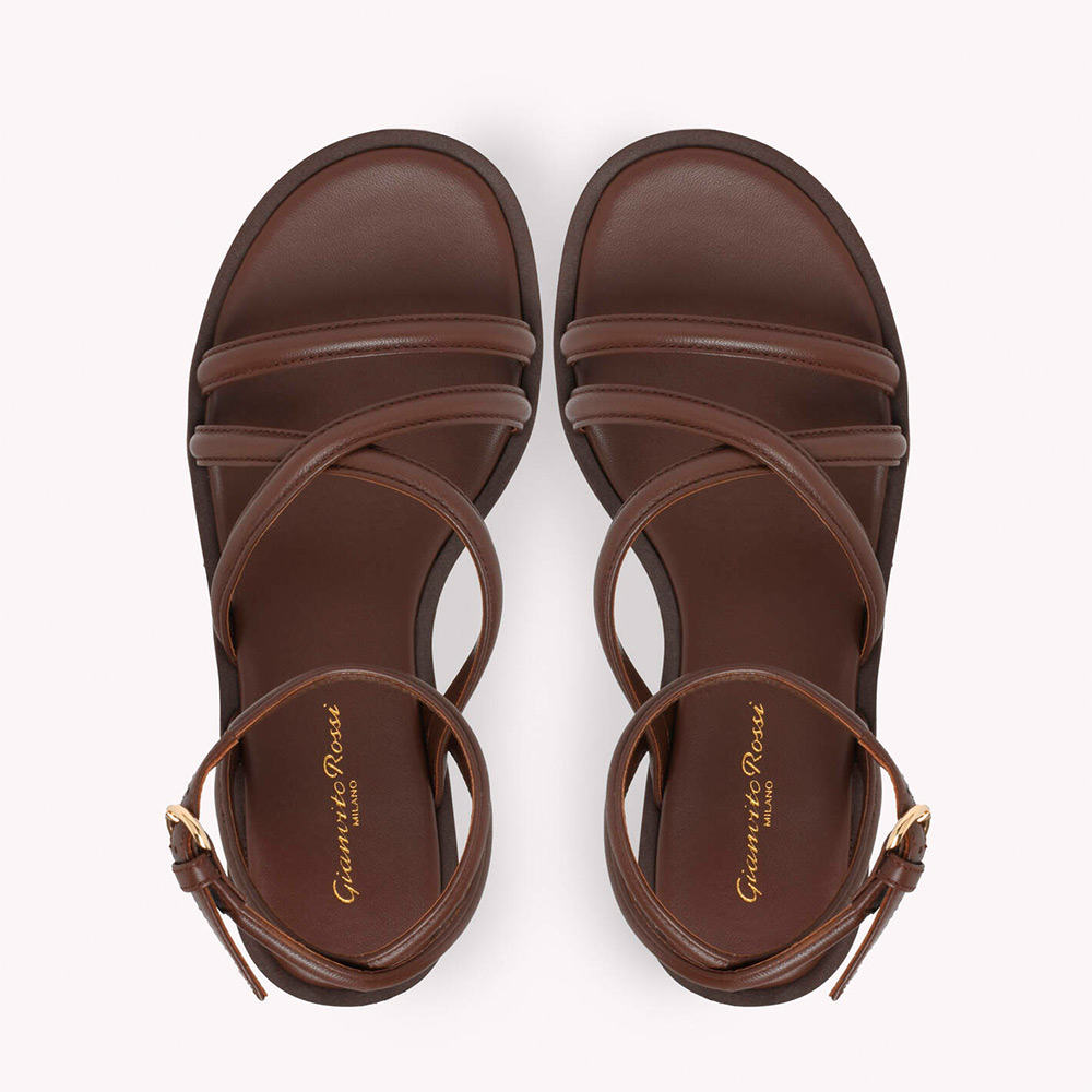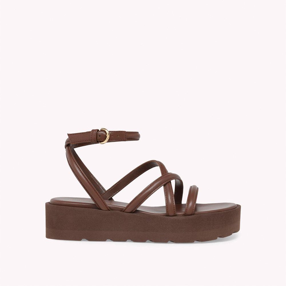 レザーから丹念に作り上げたラウンドトゥのサンダル、Nadina。アシンメトリーなデザインのアッパーが目を引く一足です。フラットなプラットフォームソールの厚さは、前側が40mm、後ろ側が45mm。アンクルストラップにはメタルバックルがあしらわれています。手作業によって仕上げました。