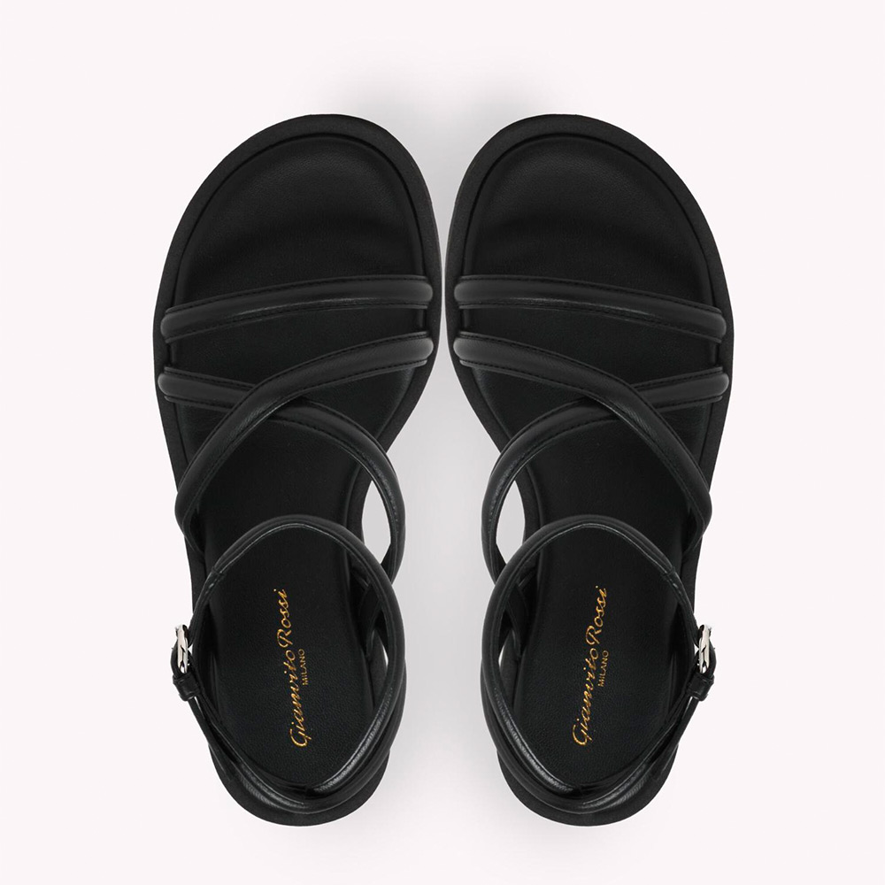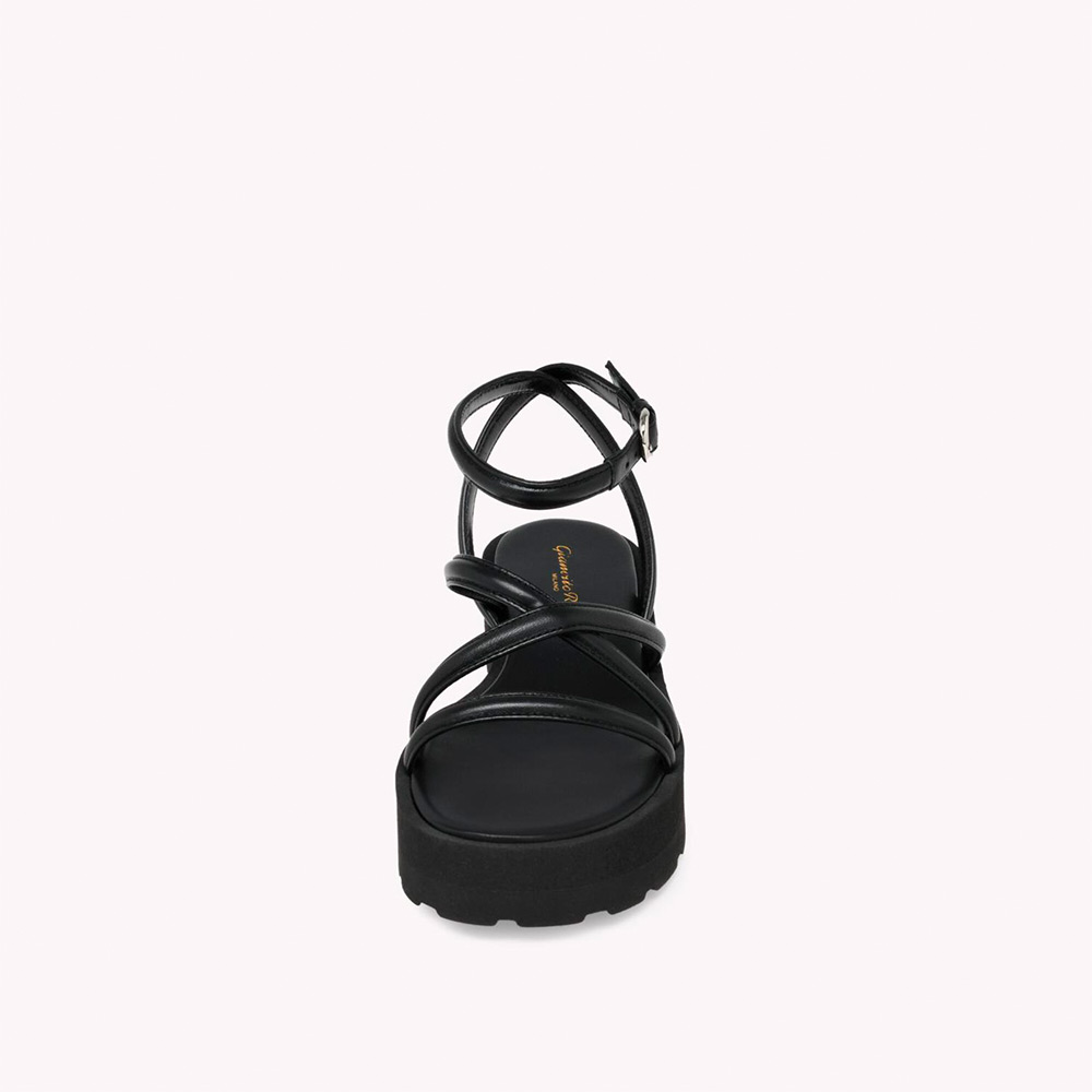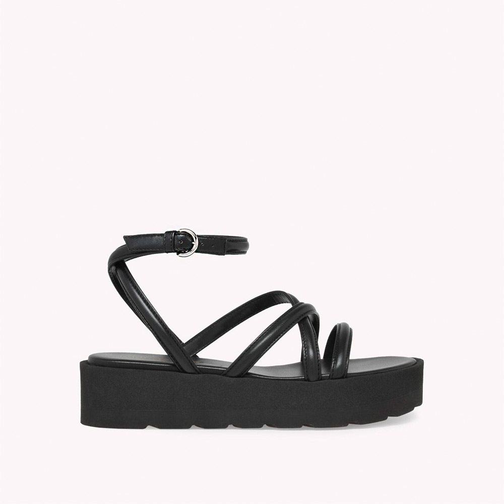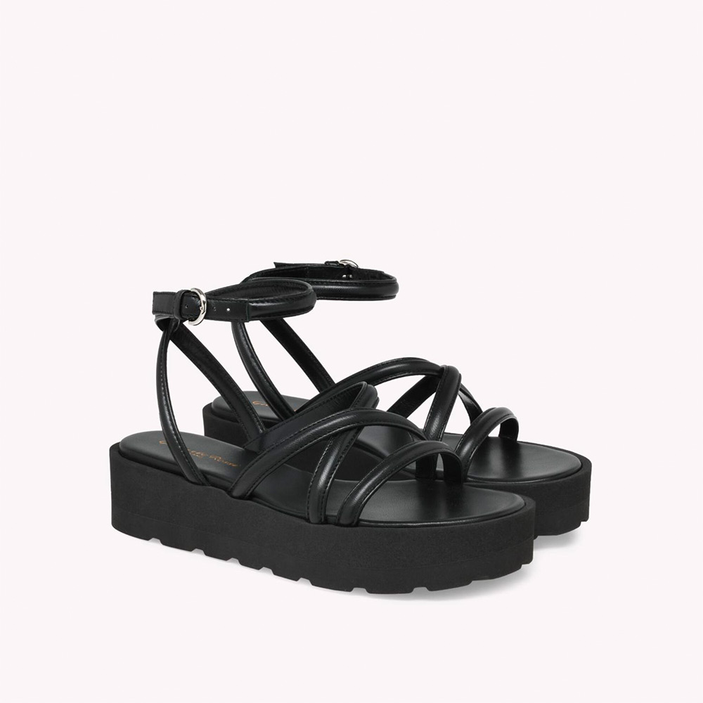 レザーから丹念に作り上げたラウンドトゥのサンダル、Nadina。アシンメトリーなデザインのアッパーが目を引く一足です。フラットなプラットフォームソールの厚さは、前側が40mm、後ろ側が45mm。アンクルストラップにはメタルバックルがあしらわれています。手作業によって仕上げました。