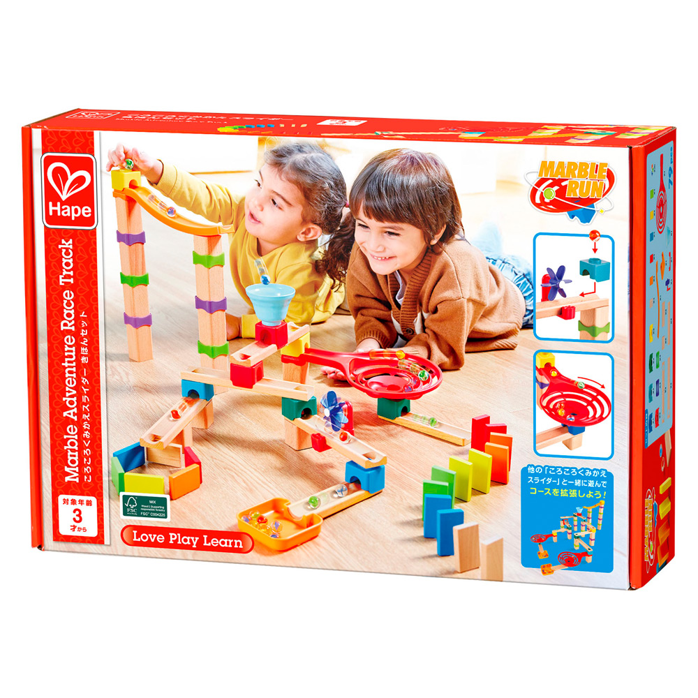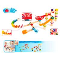 木製レールとプラスチックのジョイントパーツ、うずまきレールやロングスライダーなどのギミックパーツが入ったボール転がしです。組み立て参考例が載っているガイドブック付き。まずは親子で一緒に、ガイドブック通りに組み立ててみましょう。慣れてきたらパーツを自由に組み替えて、自分だけのオリジナルコースに挑戦。