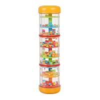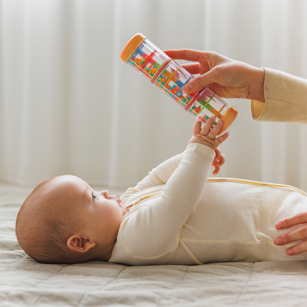 カラフルなビーズが入った透明なスティックは、上下にひっくり返すとビーズがザザーと流れ、音と動きの不思議に赤ちゃんがじっと見入ってしまうと評判の楽器です。小児科医が予防接種を打つ前に使っていることもあるそうです。チリで生まれた木製楽器がルーツ。赤ちゃんが目で追えるようビーズの落ち方も正確に計算・設計されています。勢いよくひっくり返すと雨の音、ゆっくり傾けると波の音と、振り方でさまざまな音が表現できます。ぜひ目を閉じて音に耳を澄ませてみてください。横向きにして小刻みに振れば、本格的なシェーカーの音色が出せます。筒状のフォルムはころころ転がしても楽しめます。ずりばい・寝返りの練習には届きそうで届かない場所に少しずつ移動して「あともう一歩の動き」を楽しく応援してあげることもできます。イスラエルの楽器メーカーが低年齢から楽器に親しんでほしいと開発しています。