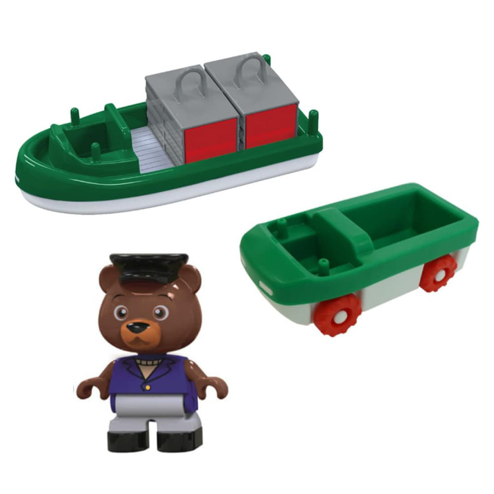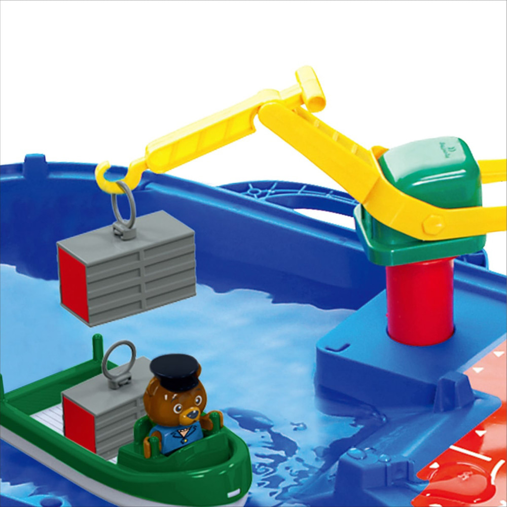 セット内容:水路パーツ×8、コネクター×8、パドル×1、水門×3、クレーン×1、コンテナ×2、トラック×1、ボート×1、人形×1(くま)、ポンプ×1、階段付スロープ×1、スロープ×2、橋げた×1、橋×2、ゴムシール×16