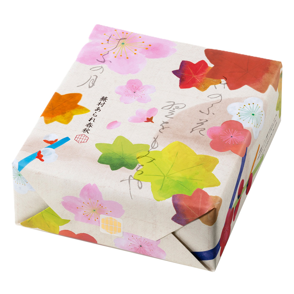 日本の風雅を代表する三つの景物を詠い込んだ蕪村の俳句に寄せて、四季の彩りをお菓子に表現しました。梅・紅葉・満月・四角の愛らしいひと口サイズの形で、あおさのり・ざらめ・昆布・黒豆・サラダ・えび・ごま・甘醤油の八趣の味わいをご用意いたしました。8ヶのあられを1つの袋に入れた個包装が30袋入った缶入りの商品です。