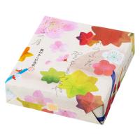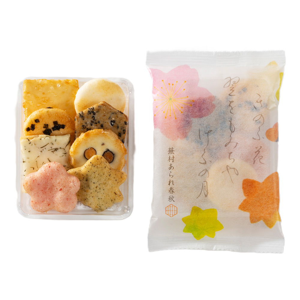 日本の風雅を代表する三つの景物を詠い込んだ蕪村の俳句に寄せて、四季の彩りをお菓子に表現しました。梅・紅葉・満月・四角の愛らしいひと口サイズの形で、あおさのり・ざらめ・昆布・黒豆・サラダ・えび・ごま・甘醤油の八趣の味わいをご用意いたしました。8ヶのあられを1つの袋に入れた個包装が16袋入った缶入りの商品です。