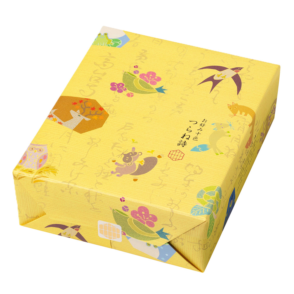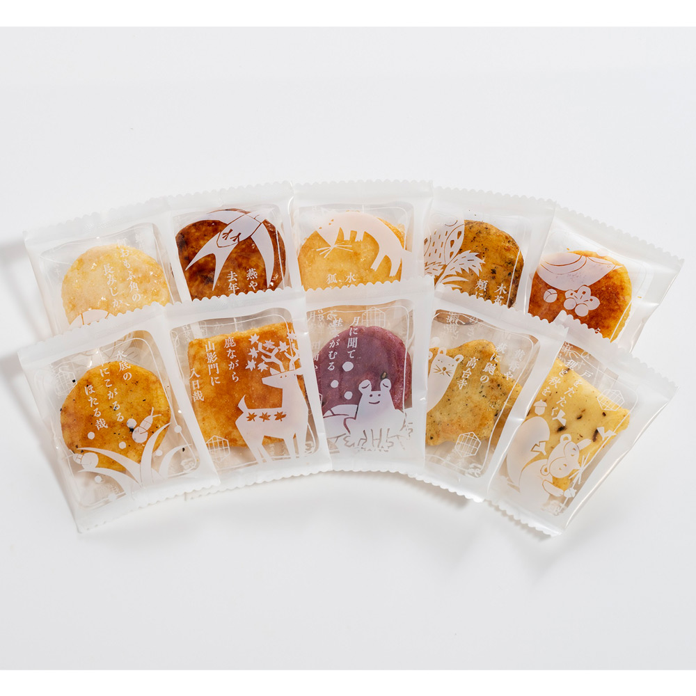 生きものの姿に目を向けた蕪村の俳句の中から十種の俳句に登場する生きものたちを意匠に可愛らしくデザインをした、いろとりどりの10種のあられ(二度漬け醤油、紫いも、あおさのり、あまから、カレー、京七味、蜜がけ、焦がしチーズ、ごぼう、塩ざらめ)です。1枚1枚個包装されたあられが約116袋(270g)入った箱入りの商品です。