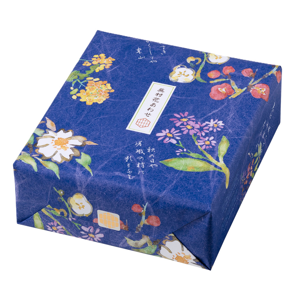蕪村あられ春秋 4袋(1袋8ヶ入)、青磯のかほり 4枚、のたりのたり 5枚、花満月 5枚、えび名月 5枚、塩名月 4枚、蜜名月 4枚、蕪村五・七・五 3袋(1袋19g)、つらね詩 1袋(36g)
