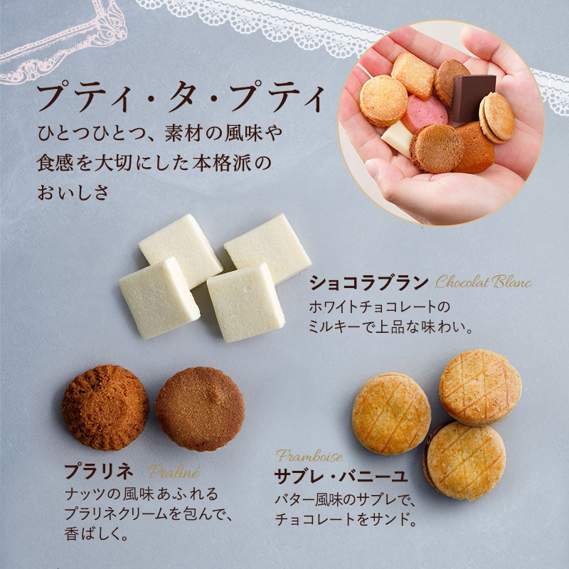 <プティ・タ・プティ>(フロマージュ)練り込んだチーズが香る、軽やかな食感。(ショコラ・ノワール)とろけるスイートチョコレートを練り込みました。(ショコラ・ブラン)ホワイトチョコレートのミルキーな味わい。(フレーズ)甘い香りとともに味わう、いちごのサブレです。(サブレ・バニーユ)バター風味のサブレでチョコレートをサンドしました。(プラリネ)プラリネクリームを包んで、香ばしく仕上げました。(フランボワーズ)木いちごのジャムを包んでしっとり甘く。(ガレット・ブルトンヌ)ホロリとくずれる、香り高いバターの風味です。(スペキュロス)シナモンが豊かに広がるざっくり食感です。