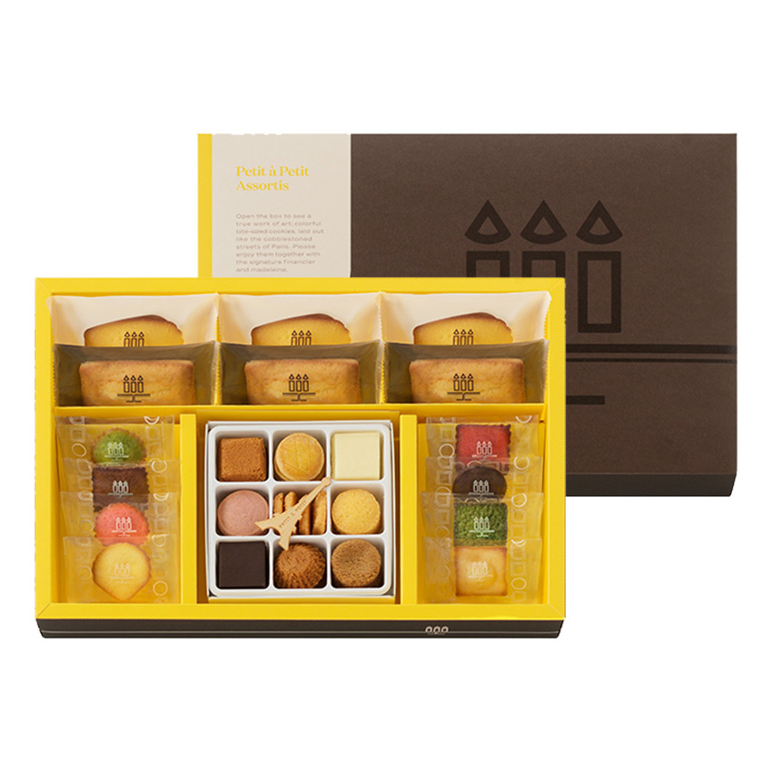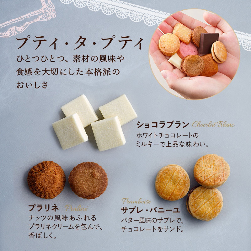<プティ・タ・プティ>(フロマージュ、ショコラ・ノワール、ショコラ・ブラン)各4個、(フレーズ、サブレ・バニーユ)各3個、(プラリネ、フランボワーズ、ガレット・ブルトンヌ、スペキュロス)各2個、フィナンシェ 3個、マドレーヌ 3個 、<プティ・ガトー・アソルティ>(フィナンシェ、マドレーヌ、キャラメル、ピスターシュ、フランボワーズ、抹茶、ミルクチョコ、フレーズ)各1個