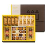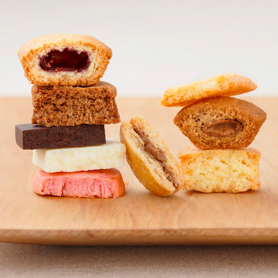 <プティ・タ・プティ>(フロマージュ)8個、(フレーズ、サブレ・バニーユ)各6個、(ショコラ・ノワール、ショコラ・ブラン、プラリネ、フランボワーズ、ガレット・ブルトンヌ、スペキュロス)各4個、フィナンシェ 4個、マドレーヌ 4個 、<プティ・ガトー・アソルティ>(フィナンシェ、マドレーヌ、キャラメル、ピスターシュ、フランボワーズ、抹茶、ミルクチョコ、フレーズ)各2個