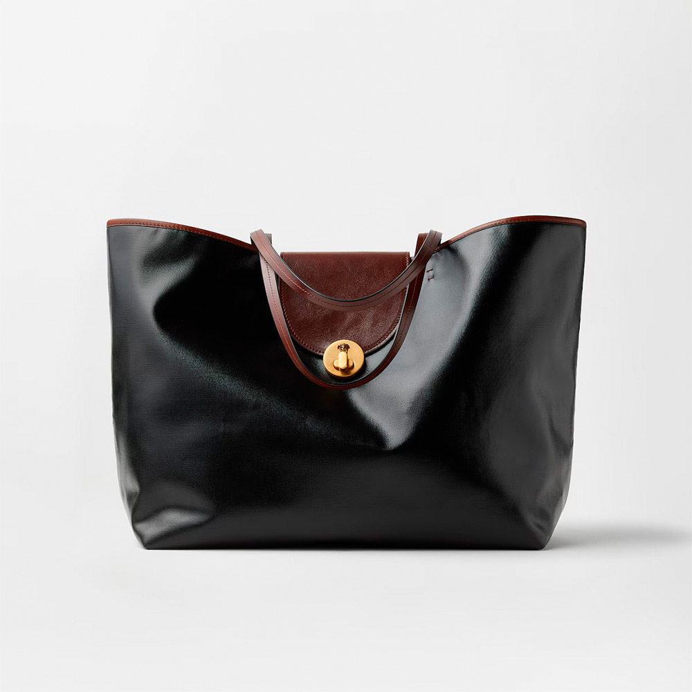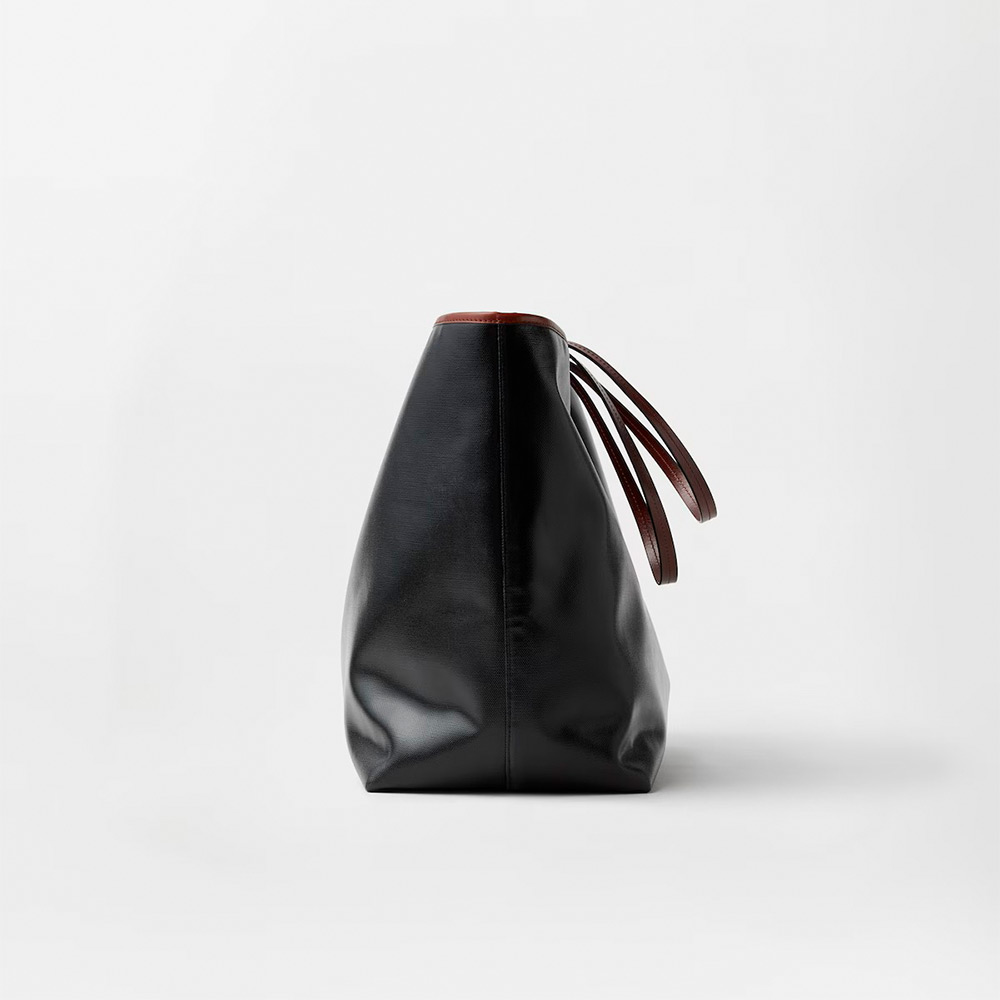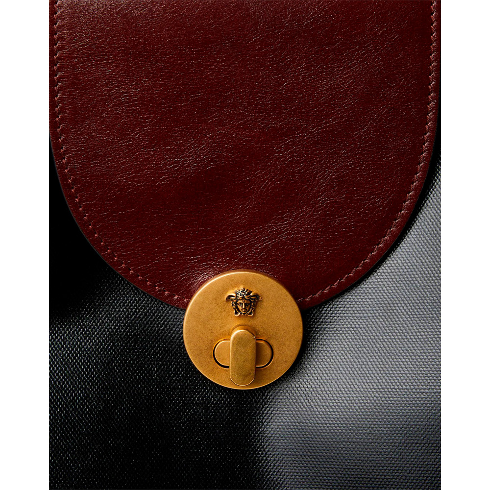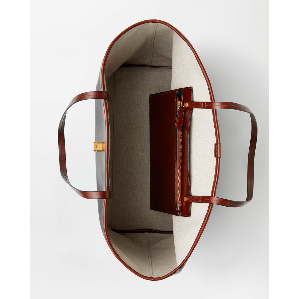 カーフ レザーのトリムで仕上げた、コーティング キャンバス地製のラージ ヴィヴィアン トート バッグ。エッジはハンドペイント仕上げ。コントラストの映えるメタル製留め具とツイストロック式の開閉部、立体的な小さなメドゥーサ ハードウェアが特徴の、優れた収納力を誇るアイテム。