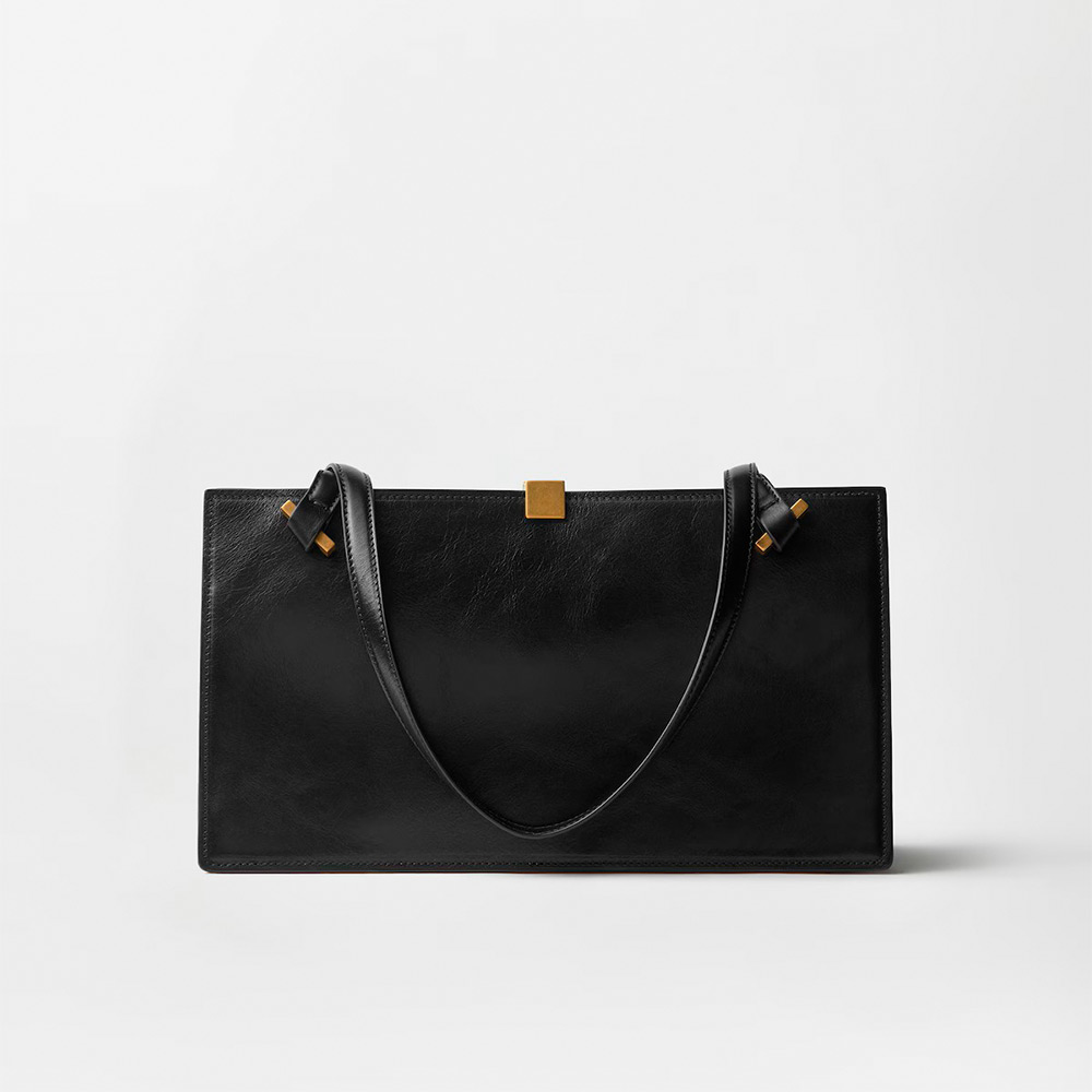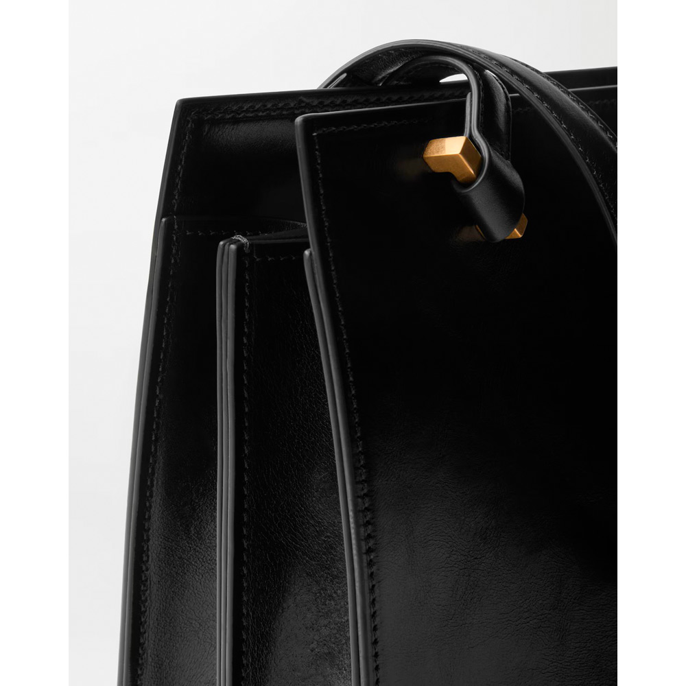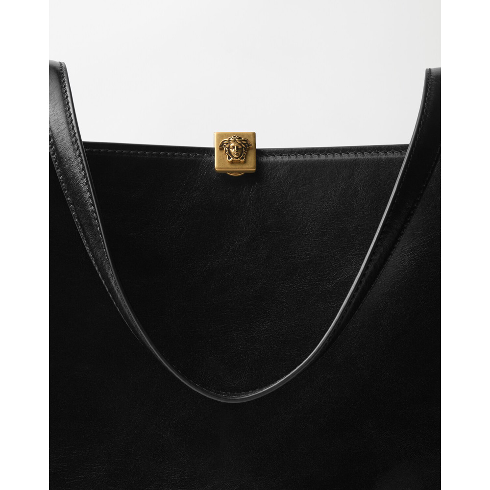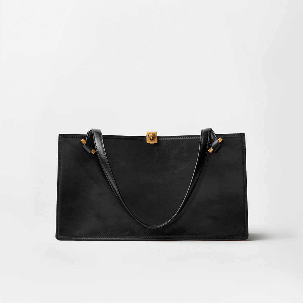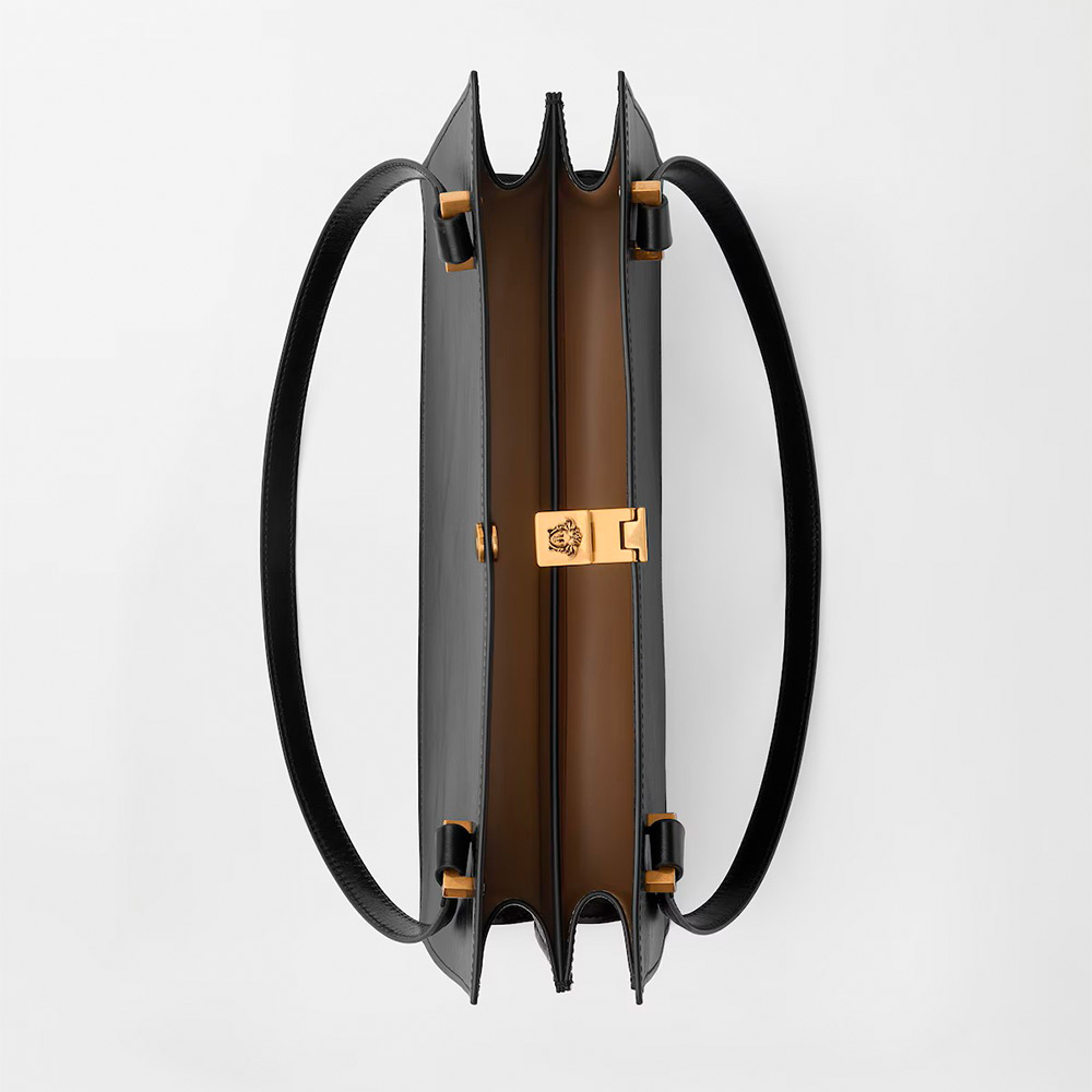 セブリーヌ ミディアム トート バッグ。独特のかっちりとした幾何学的なシルエットを大切にしつつ、柔らかなカーフ レザーで仕上げたアイテム。四角い留め具にあしらった立体的なメドゥーサ ハードウェアがアクセント。ハンドル アタッチメントには斜めにメタル製のインサート。