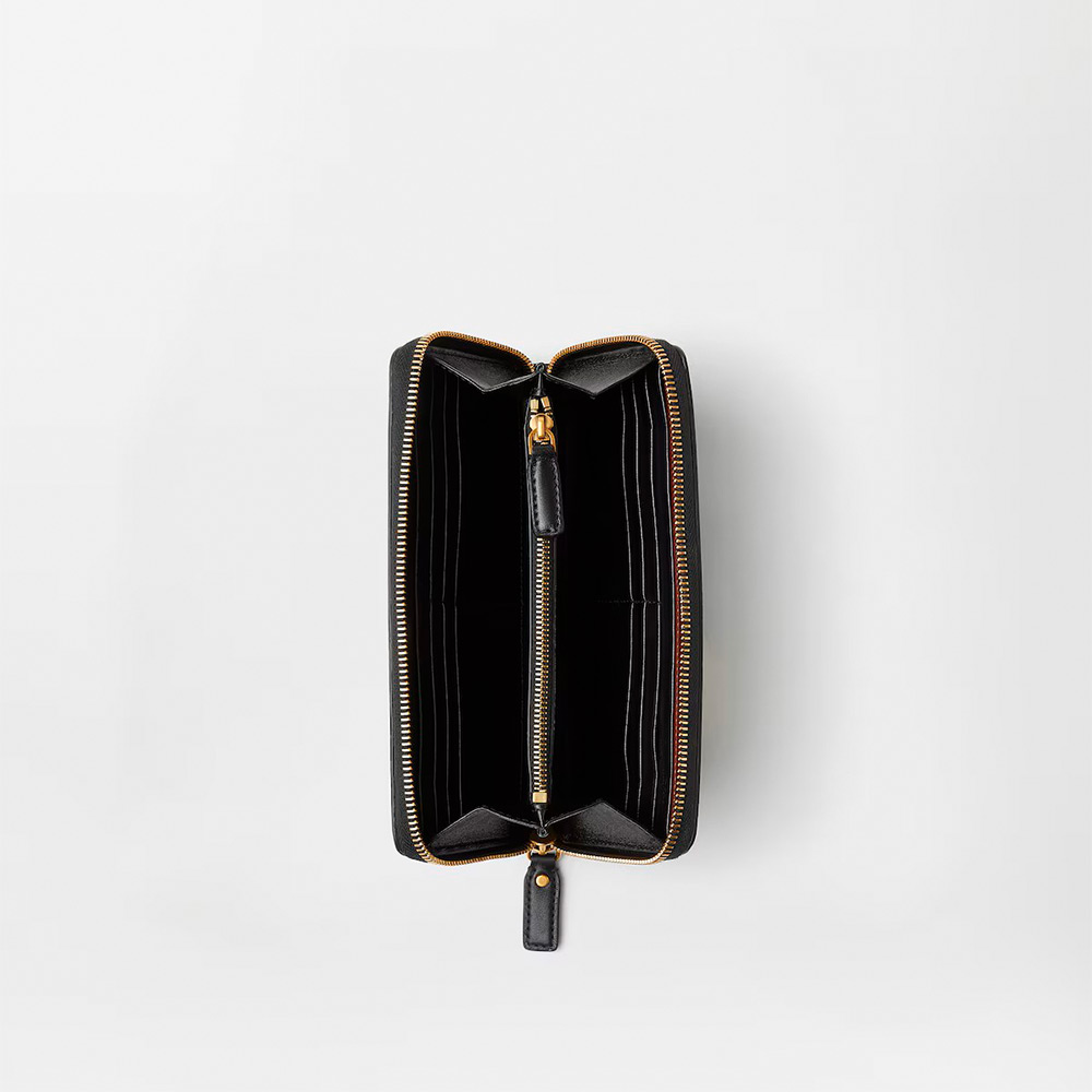 フロント面にあしらった立体的なメドゥーサ ハードウェアのアクセントが際立つ、カーフ レザー製のロング ジップアラウンド ウォレット。複数のカード スロット、ジッパー付きコンパートメント、紙幣用コンパートメントを備えた機能的なスタイル。
