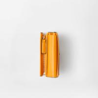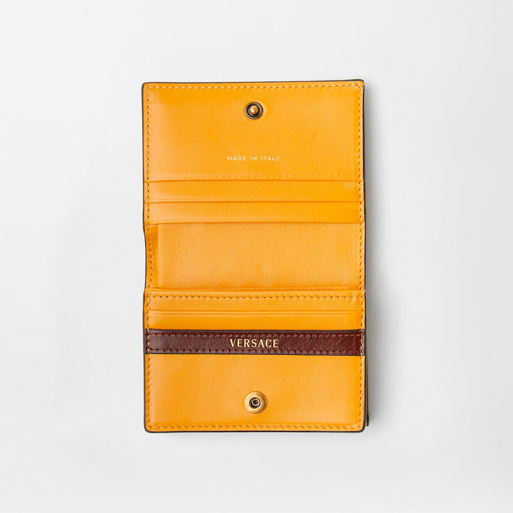 カーフ レザー製のコンパクトな二つ折りウォレット。フロント面には立体的なメドゥーサ ハードウェアのアクセント。複数のカード スロット、ジッパー付きコンパートメント、紙幣用コンパートメントを備えた実用的なアクセサリー。