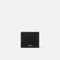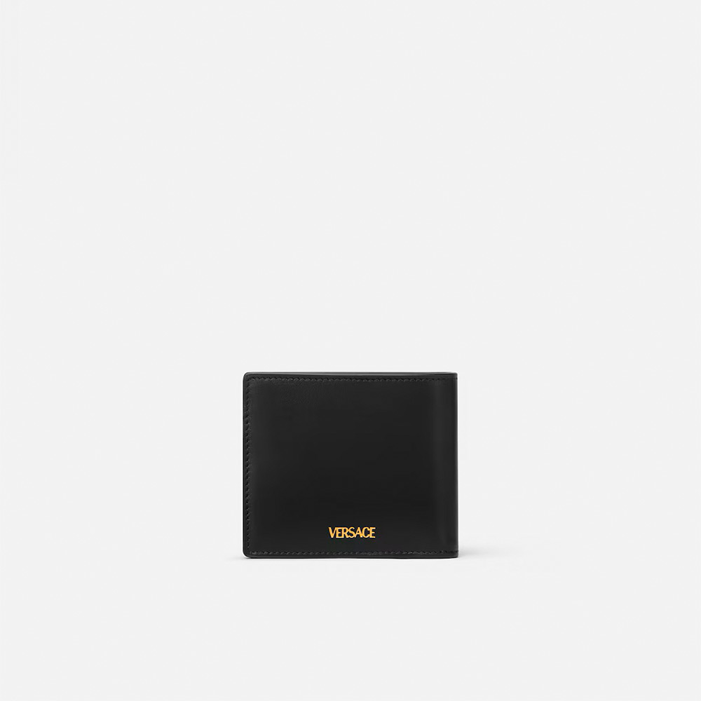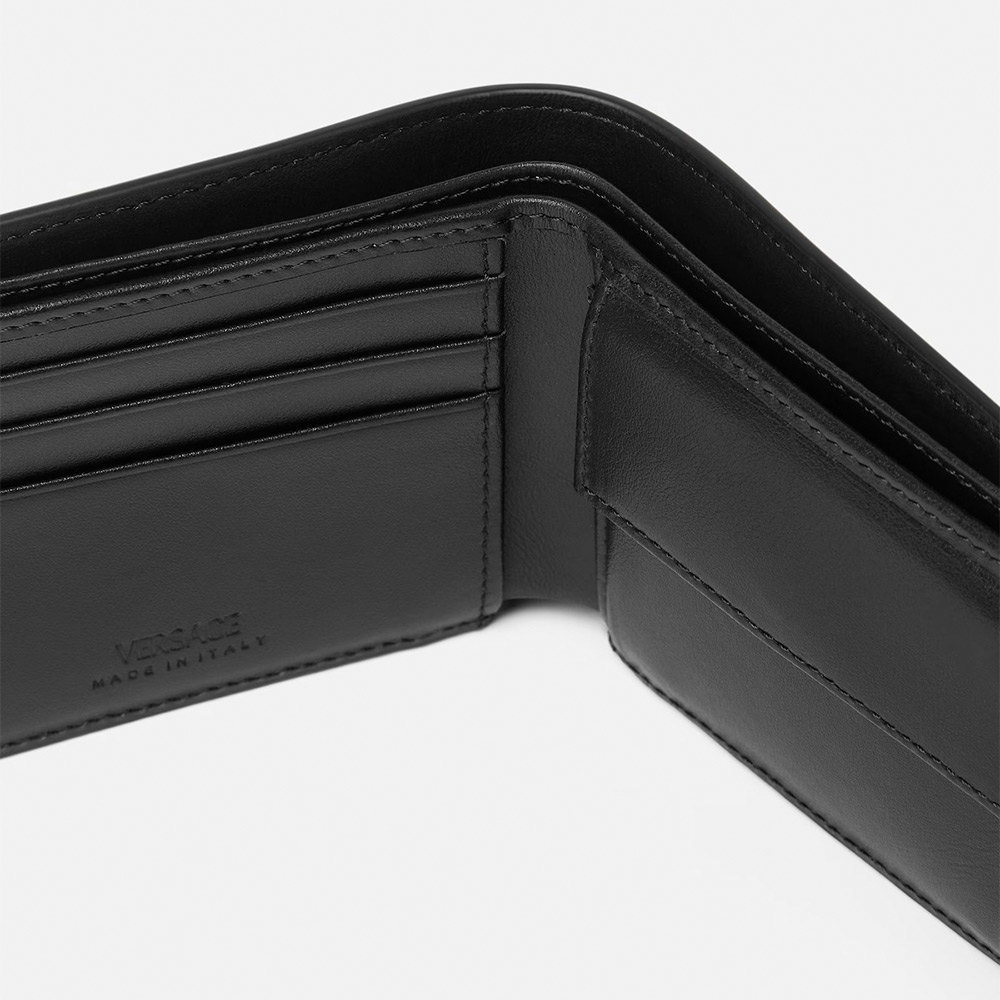 特徴的なレターV 型のハードウェア、フロント面のエナメル仕上げのヴェルサーチェ ロゴ刻印が際立つ仕上がりの、コンパクトな二つ折りウォレット。内部には複数のカード スロット、2 つの紙幣用コンパートメント、スナップボタン留めのコイン ポーチを備えたデザイン。