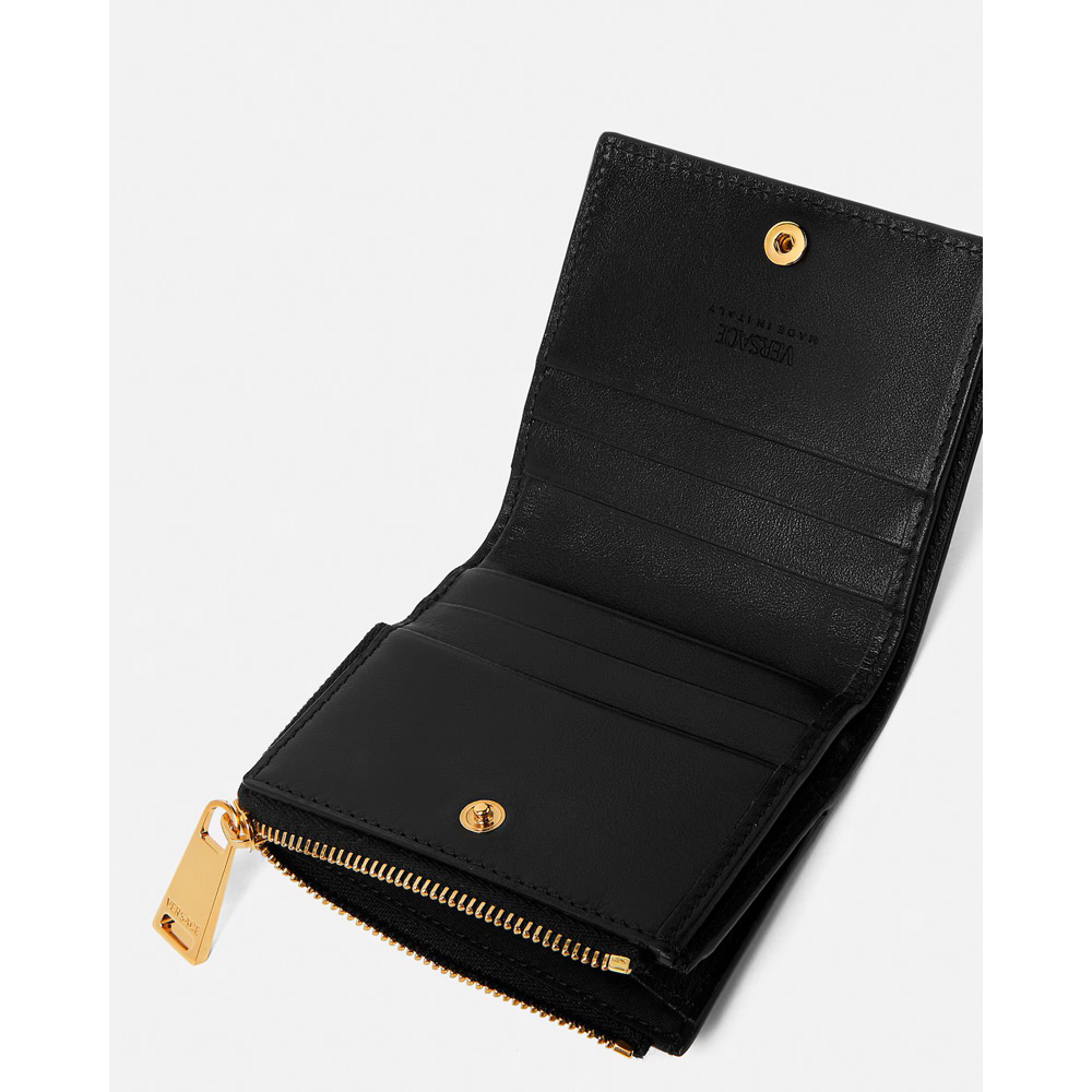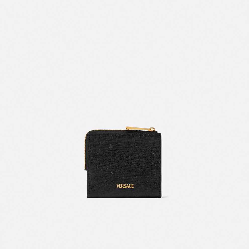 グレイン レザーから丹念に作り上げたコンパクトな二つ折りウォレット。フロント面にメドゥーサ ビギー ハードウェアのアクセント。収納力に優れたジッパー付きコイン ポーチ、内側の紙幣コンパートメント、複数のカード スロットで仕上げたスタイル。
