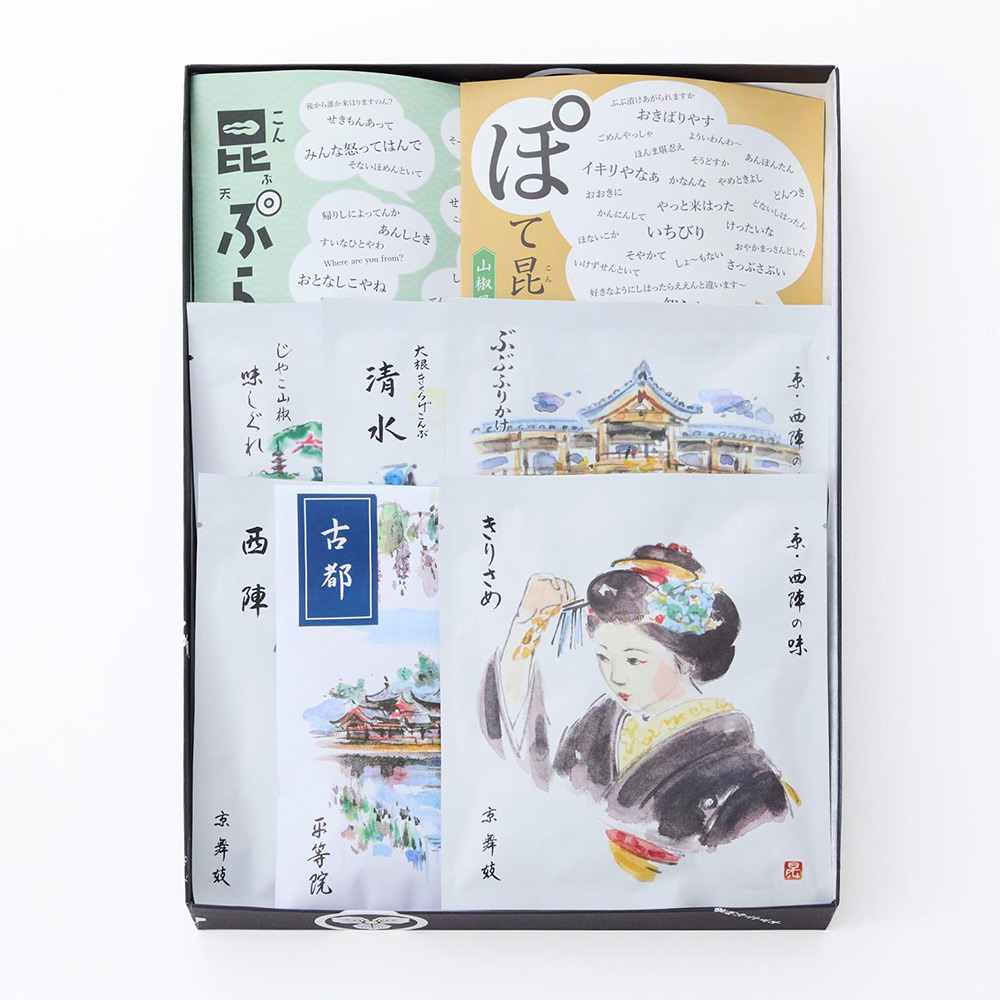 五辻の昆布がお勧めする人気商品の詰合せで、定番の山椒昆布「西陣」汐吹昆布「きりさめ」、甘辛く炊いたりめん山椒「味しぐれ」。販売以来好評いただいている細切りの昆布と干し大根きくらげの佃煮「清水」と、揚げたジャガイモに昆布茶と山椒で味付けした「ぽて昆」をセットにしました。他にも昆布に衣をつけて揚げた「昆布天ぷら」、汐吹昆布ととろろのふりかけ「ぶぶふりかけ」昔ながらの昆布豆「古都」の8点入りです。