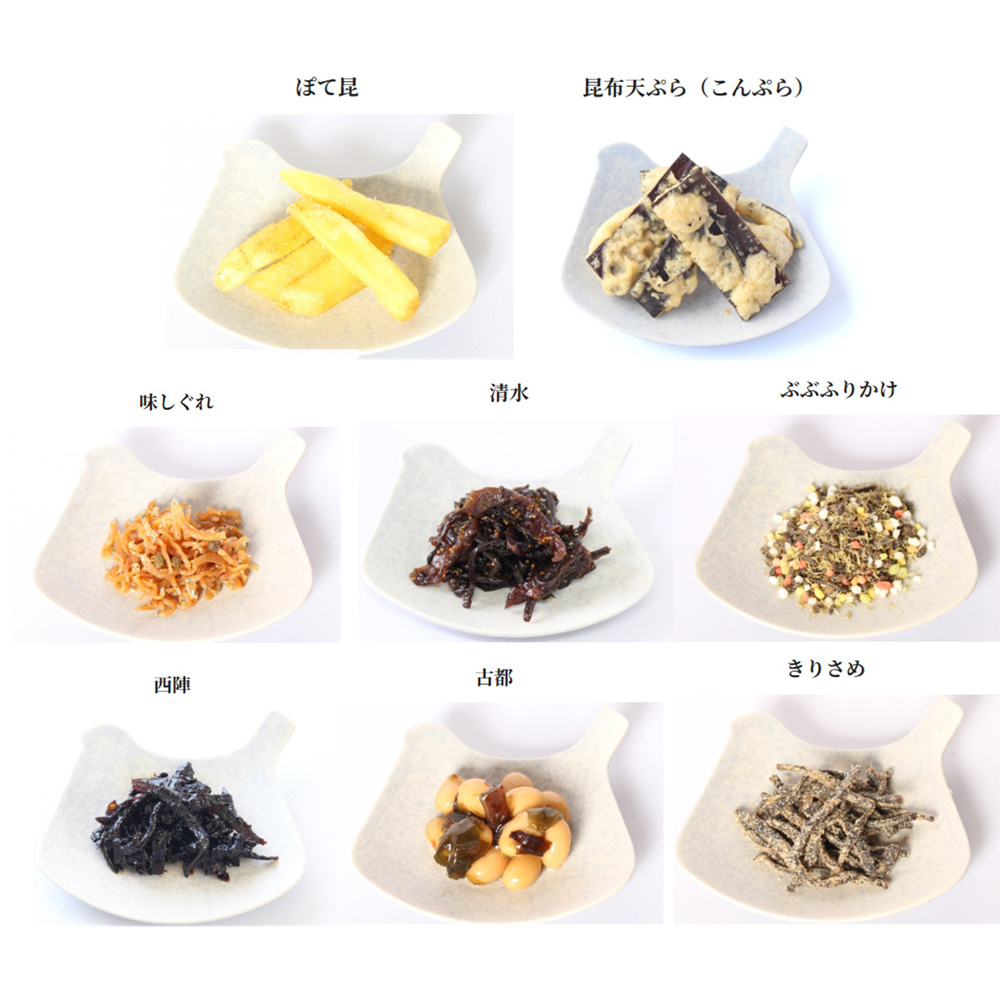 きりさめ(50g)、味しぐれ(50g)、西陣(70g)、清水(80g)、古都(100g)、ぶぶふりかけ(40g)、ぽて昆(45g)、昆布天ぷら(30g)
