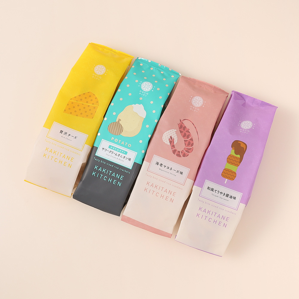 かきたねキッチンを代表する「辛くない」お味4種類のセットです。うるち米でできたかきたねはパリッとクリスピー。もち米粉にポテトを加えたかきたねポテトサワークリームオニオン味はザクザクした食感がやみつきに。おやつにもおつまみにも喜ばれる、おすすめのプチギフトです。