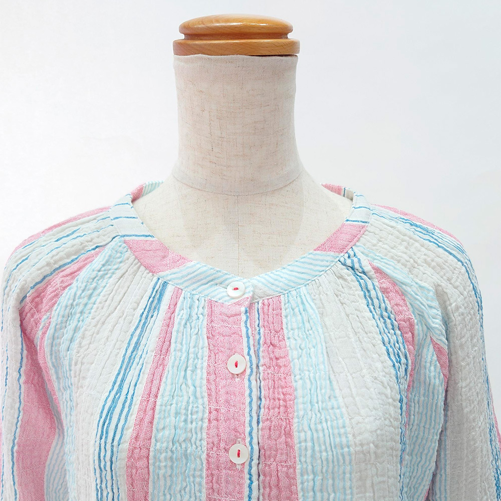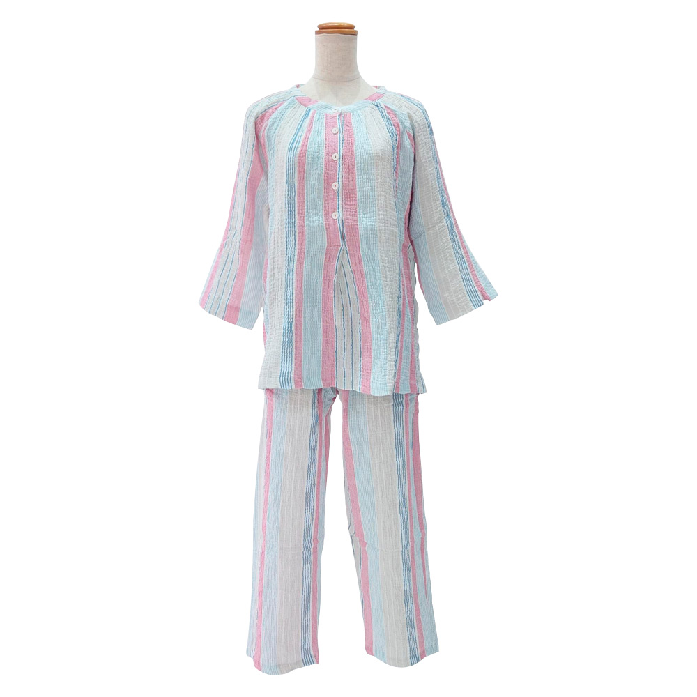 <nacrure>婦人七分袖パジャマ Wガーゼ シャーリング ストライプ (RE)