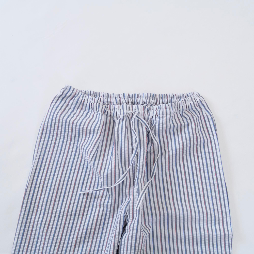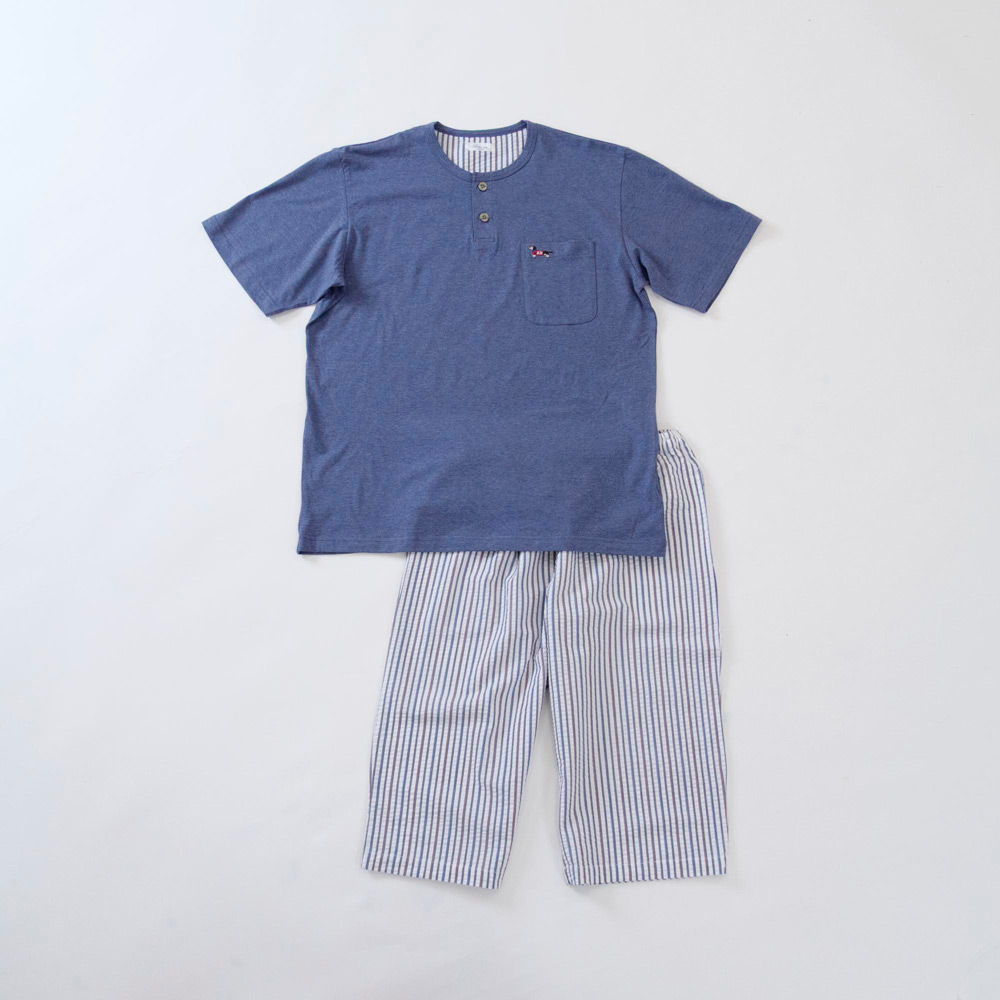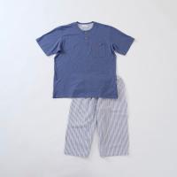 半袖Tシャツと6分丈ズボンをセットアップしたリラクシングウェア。トップスのTシャツはやわらかい薄手の天竺編みニット素材、ボトムスは肌離れの良いサッカー素材です。オフタイムにお部屋で涼しくお過ごしいただけます。