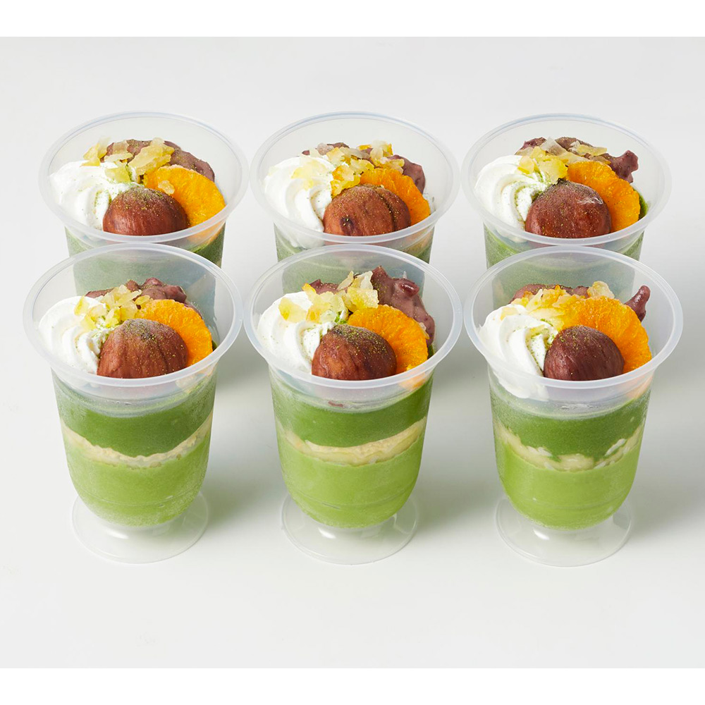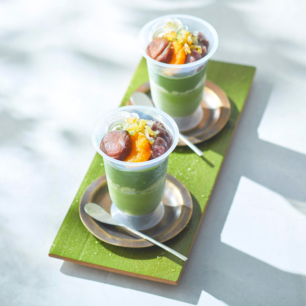 江戸時代から受け継ぐ伝統を大切にしながら、お茶の新しい価値を発信する京都・宇治のお茶屋〈伊藤久右衛門〉の宇治抹茶を使用。2層の抹茶アイスを引き立てる柚子ソースと柚子クランチがアクセント。あずきと渋皮栗、みかんを添えて。