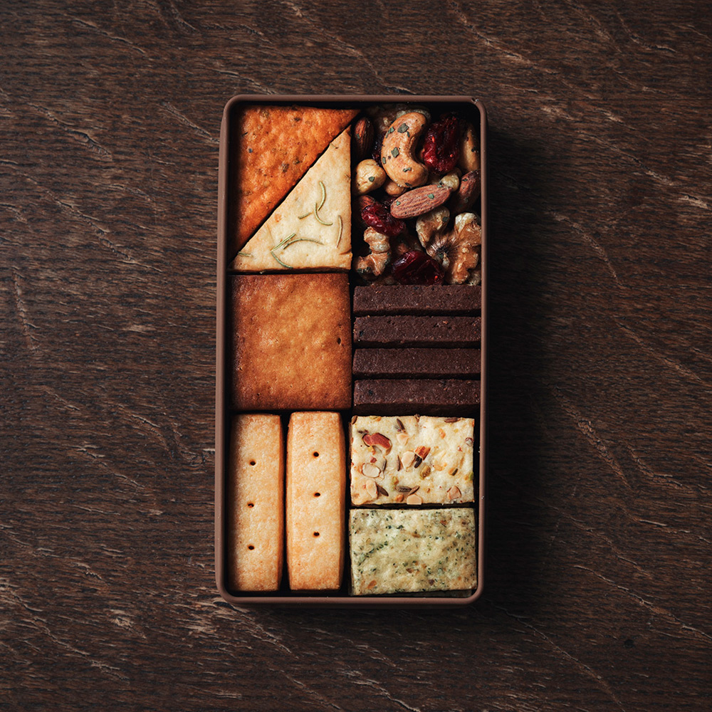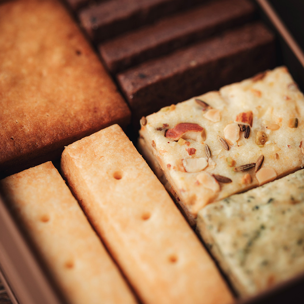 クッキー・サレとよばれる塩味のクッキーを集めた「ヨルのクッキー缶」。ハーブの香り、スパイスの刺激、チーズの芳醇さ。8種類それぞれに、さまざまな食感と香りを楽しめる個性的なクッキーを揃えました。コーヒーはもちろん、ワインやビール、ウィスキーなど、お好みのお酒と一緒に楽しんでいただけるようイメージし、試作を重ねて作り上げた、いわば「おつまみ缶」。特別な装いで、くつろぎのひと時といっしょにお届けします。贈りものにうれしい、シンプルで愛らしいデザインです。缶を開ける瞬間の、幸せな気持ちをお届けしたい。そんな思いで一つ一つ丁寧に焼き上げています。