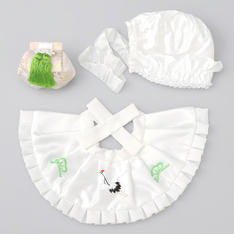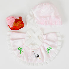 お子様の誕生に感謝し、健やかな成長を願うために氏神様などに参拝する「初宮参り」。お宮参りに必要な帽子・よだれかけ・御守のセットです。お子様の身を守る意味が込められています。よだれかけにはおめでたい鶴と松の刺しゅうがほどこされています。