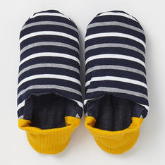 楽しい柄のてぬぐいと綿生地を組み合わせて仕立てたスリッパです。お使いいただくとともに風合いが良くなり、丸ごと洗えるので衛生的にお使いいただけます。またてぬぐい生地から縫製までを、すべて国内生産にこだわって製作しました。かかとを起こしてルームシューズとしてもご使用いただけるバブーシュタイプです。