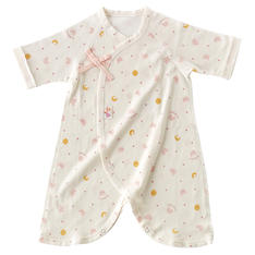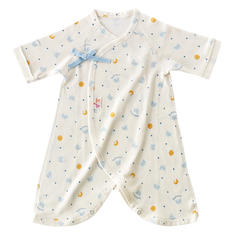 素材は肌ざわりが気持ちいい二重織ガーゼを使用。生まれたばかりの赤ちゃんのデリケートな肌も優しく包みます。通気性・吸水速乾性にも優れているので、夏場でもさらっと気持ちよく着られます。股部分はホックボタンで開くので、オムツ替えもしやすく便利。ショートオールのように上下がつなぎになっているから、抱っこやハイハイでも、お腹が出る心配がありません。花火大会や夕涼みだけでなくお部屋着やお風呂あがりにも大活躍です。
