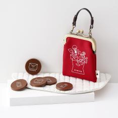 すっかりお馴染みになった京都のチョコレート屋さんと京都のがま口専門店とタッグを組んだ三三屋オリジナルシリーズに、ポーチが登場。転写プリントが可愛いキャラメルクリーム入りの口溶けのよいショコラをいただいた後は、コスメやアクセサリーなどの小物の小分け用ポーチとしてバッグインに。※「ありがとう」のメッセージ入り、オリジナル小袋(紙製)をお付けします。