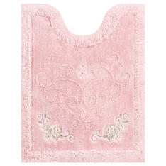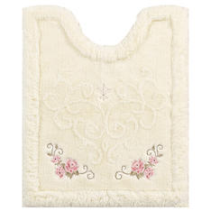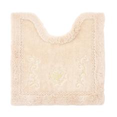 光沢感のあるアクリル糸を使用。ヨーロッパ調の装飾オーナメント柄を地柄で立体的に表現。バラの刺しゅうにはラインストーンを取り付け華やかにしました。上品でエレガントなトイレマットです。