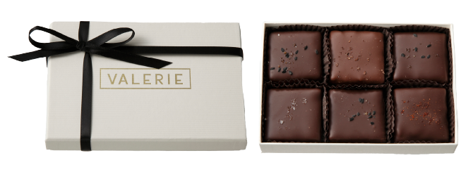 アーモンドフルール・ド・セルトフィーはカリフォルニア産アーモンドとフランス産の海塩、フルール・ド・セルをあわせました。デュランゴトフィーはダークミルクチョコレート、それ以外は61%のビタースイートチョコレートでコーティングしています。