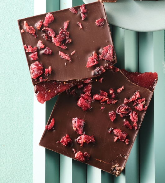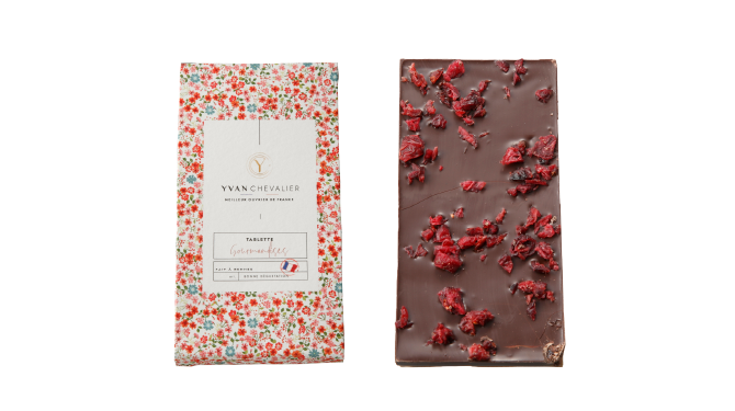 『タブレット ライチ&フランボワーズ』は、フランボワーズとライチを丁寧にピュレにし、ダークチョコレートでコーティングしました。さらにクランベリーで酸味を効かせ、僕の繊細で女性的な面もある感覚をいかして仕上げた今年の新作で、高島屋限定のタブレットです。