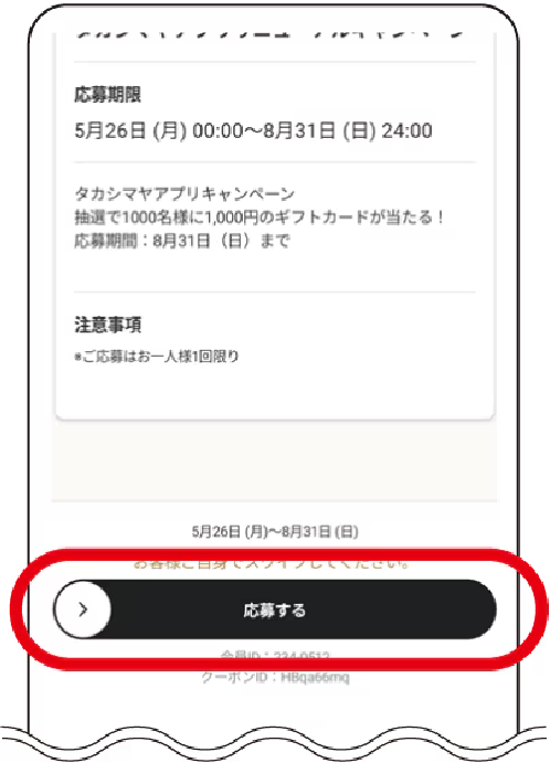 タカシマヤアプリをダウンロードのうえ、会員登録をしていただき、「クーポン・特典」の応募画面よりご応募ください。後日抽選を行い、12月20日(土)頃に抽選結果のメッセージをお送りいたします。抽選結果はタカシマヤアプリのメッセージ内「あなたへのメッセージ」に配信いたします。