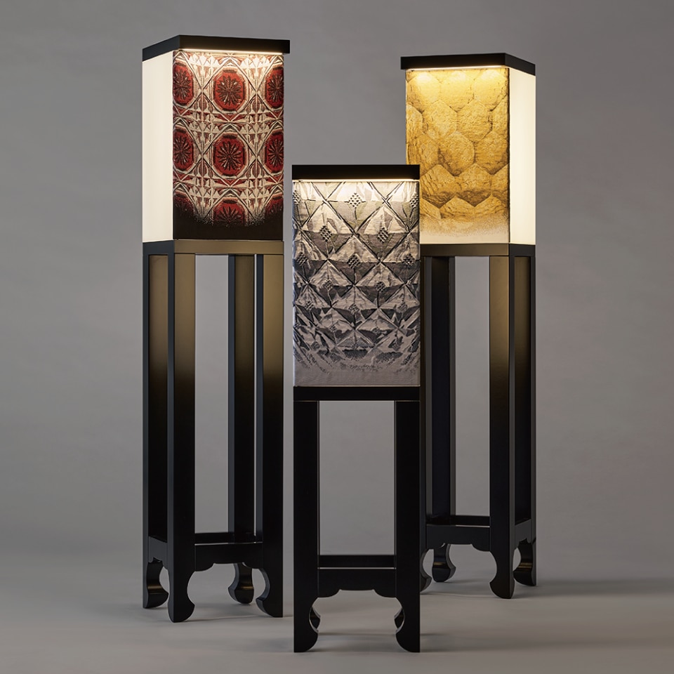 四代龍村平藏作のガラス工芸をモチーフとした錦帯を使用し、日本の伝統的なフロアライトである行燈を再解釈。
