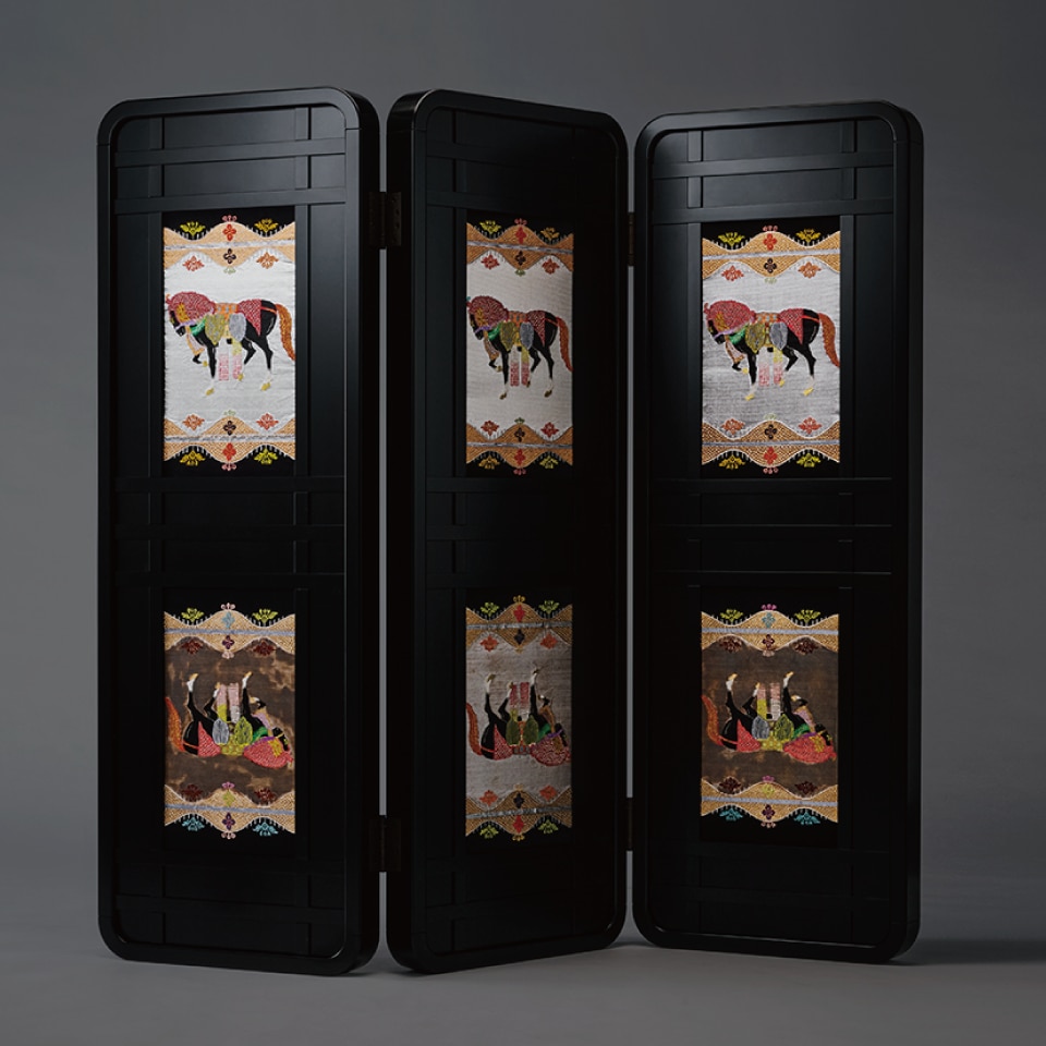 初代龍村平藏作「天竺祭馬錦」をふんだんにあしらった屏風はまさに空間を仕切る「機能性と可動式」のアート。