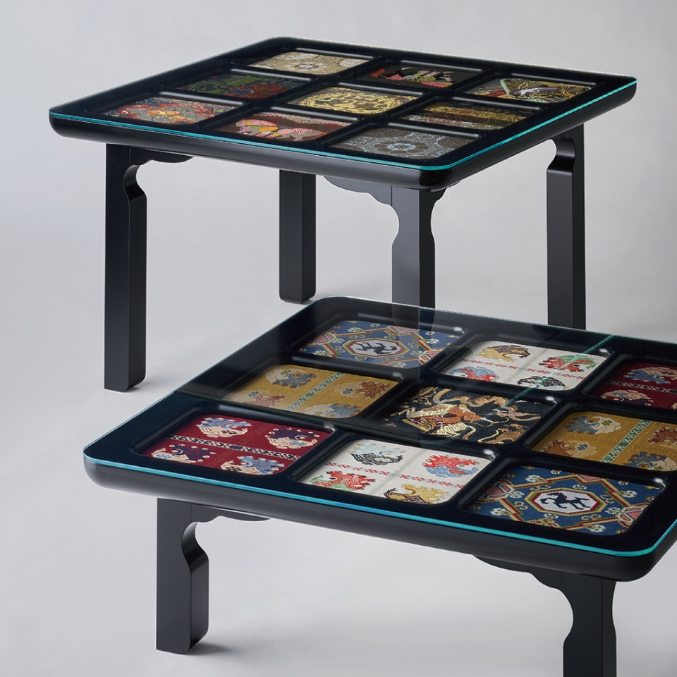 大胆にも、各代平藏作の錦帯をはめ込んだ格天井を天板とし、日本の格式・美意識を楽しめるテーブル(ハイ、ロー2種)。