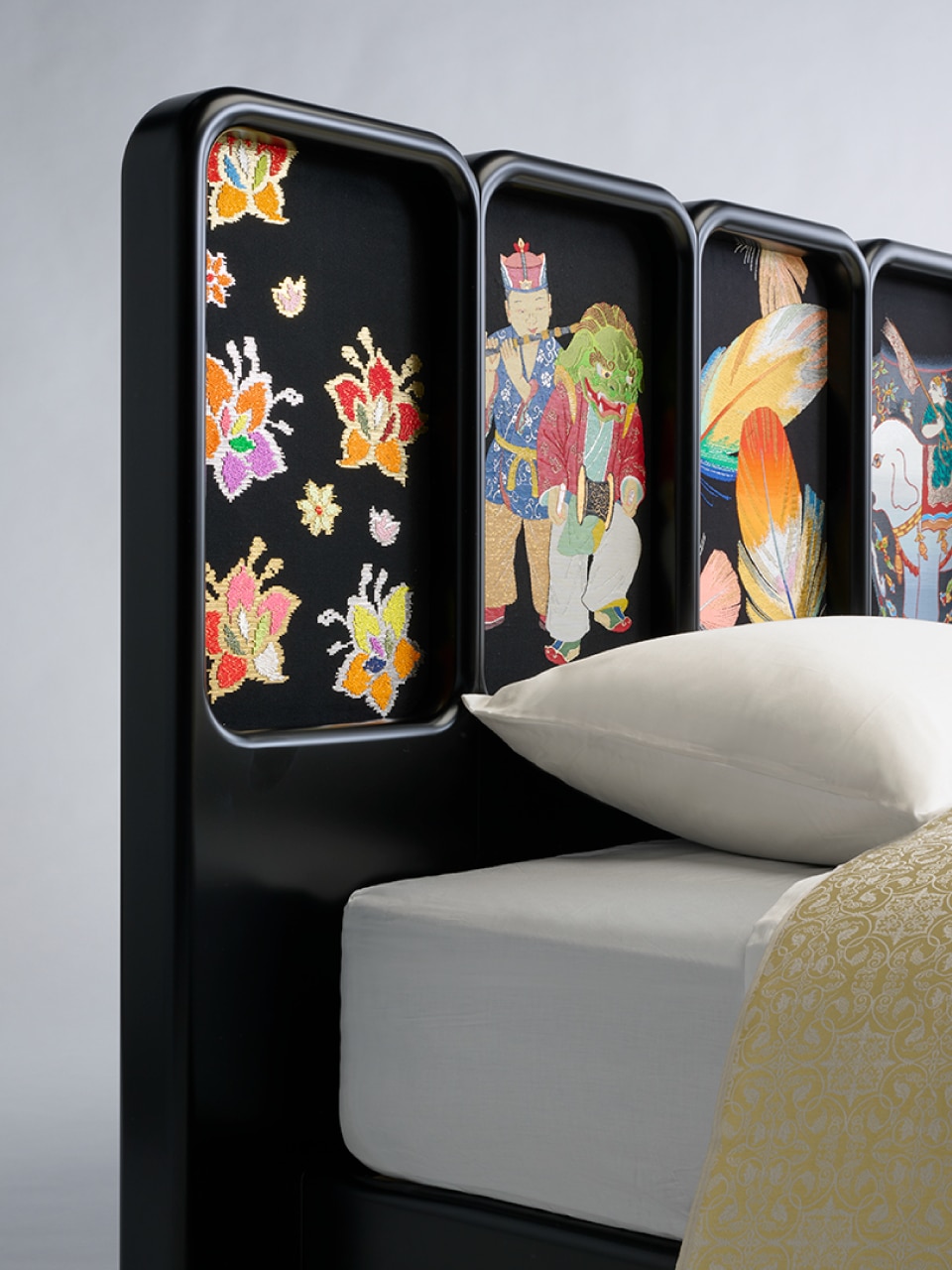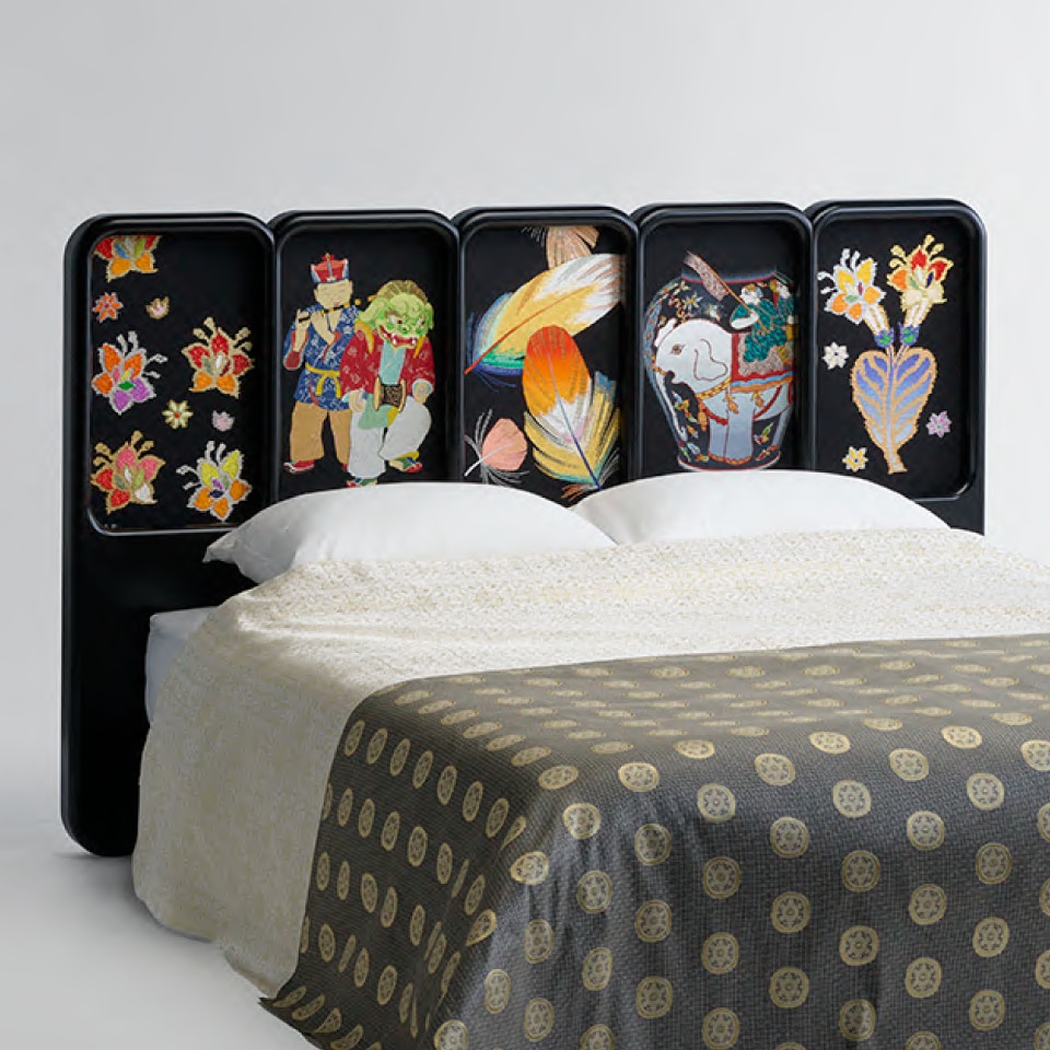 黒地にインパクトのある錦帯ならではの独創的な柄が並んだベッドボードは究極のプライベート空間である寝室をさらに一段個性的に選出。