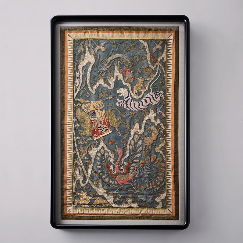 初代龍村平藏が朝鮮半島で発掘された出土品の装飾をモチーフに創作した「漢羅『楽浪』」を新たに額装。